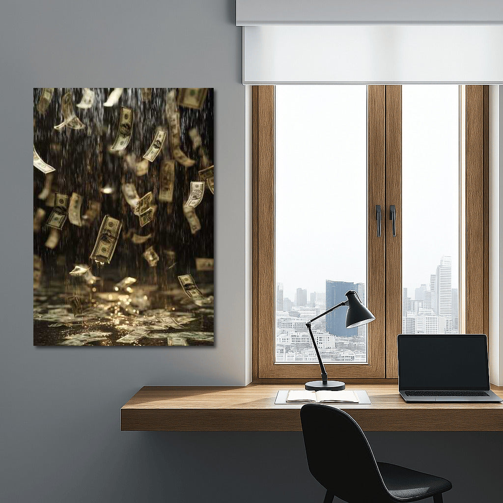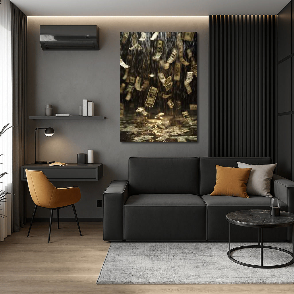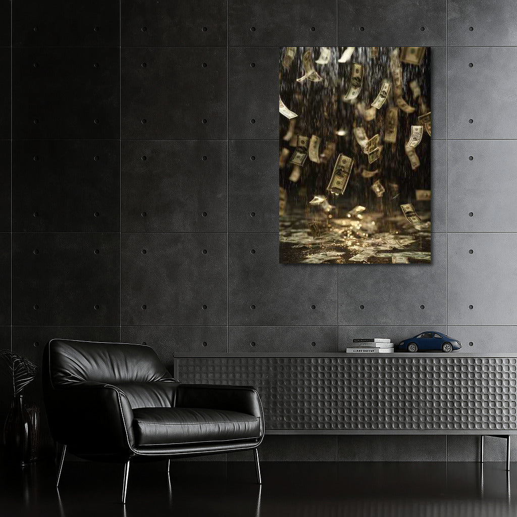 Banknotes in dance like rain of luck. This poster will become a bright accent and a symbol of prosperity in your space. See more from the collection: Money Art