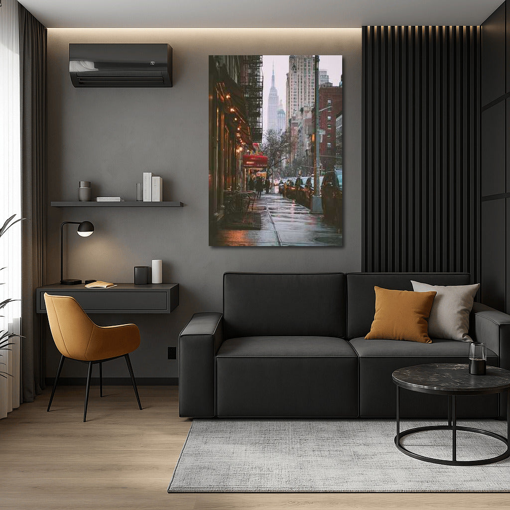 Poster with New York atmosphere: rainy street, city lights and grandeur of Skyscrapers. Wall art full of life. See more from the collection: Country Art