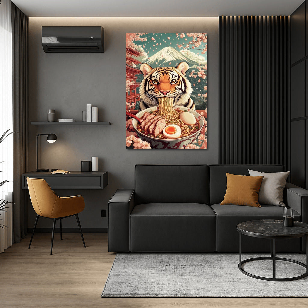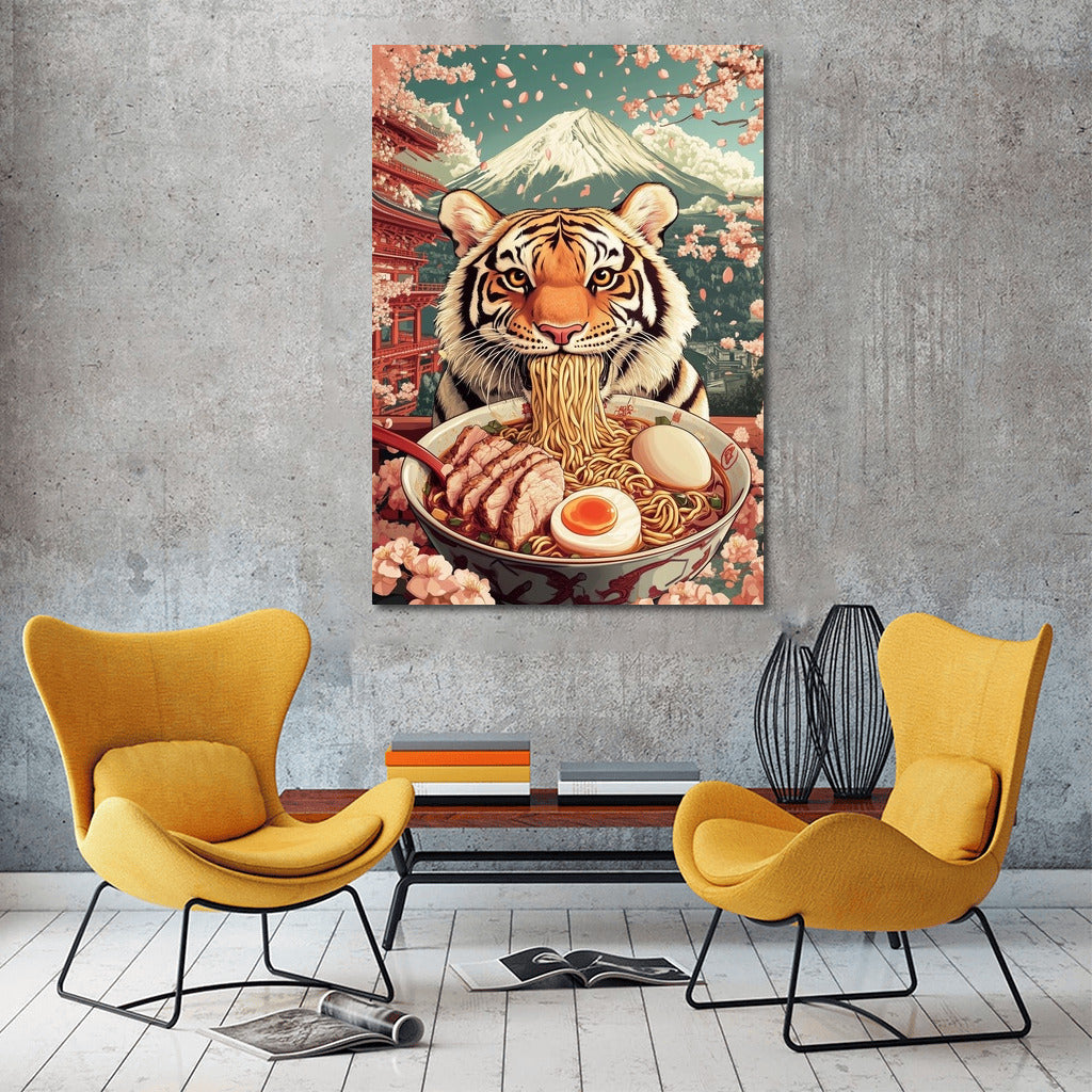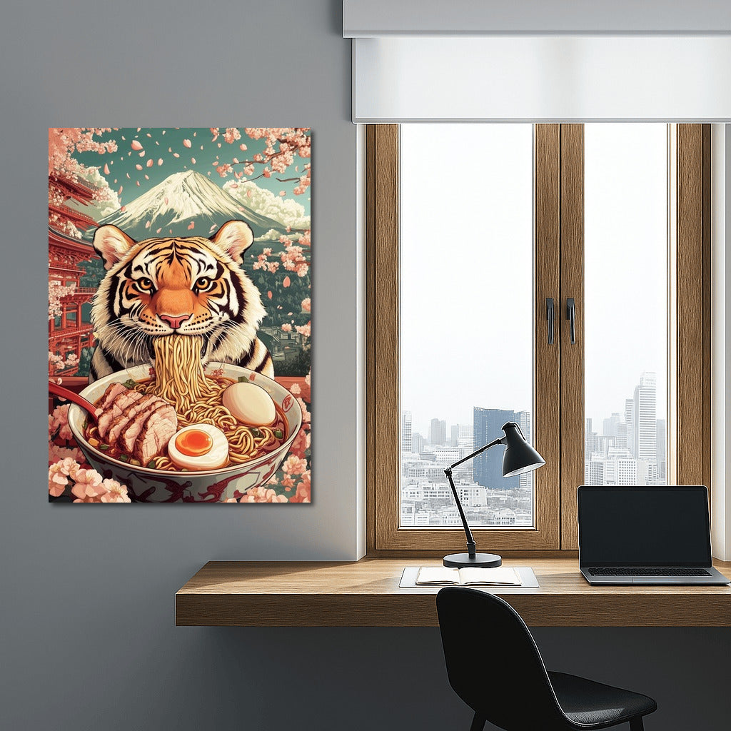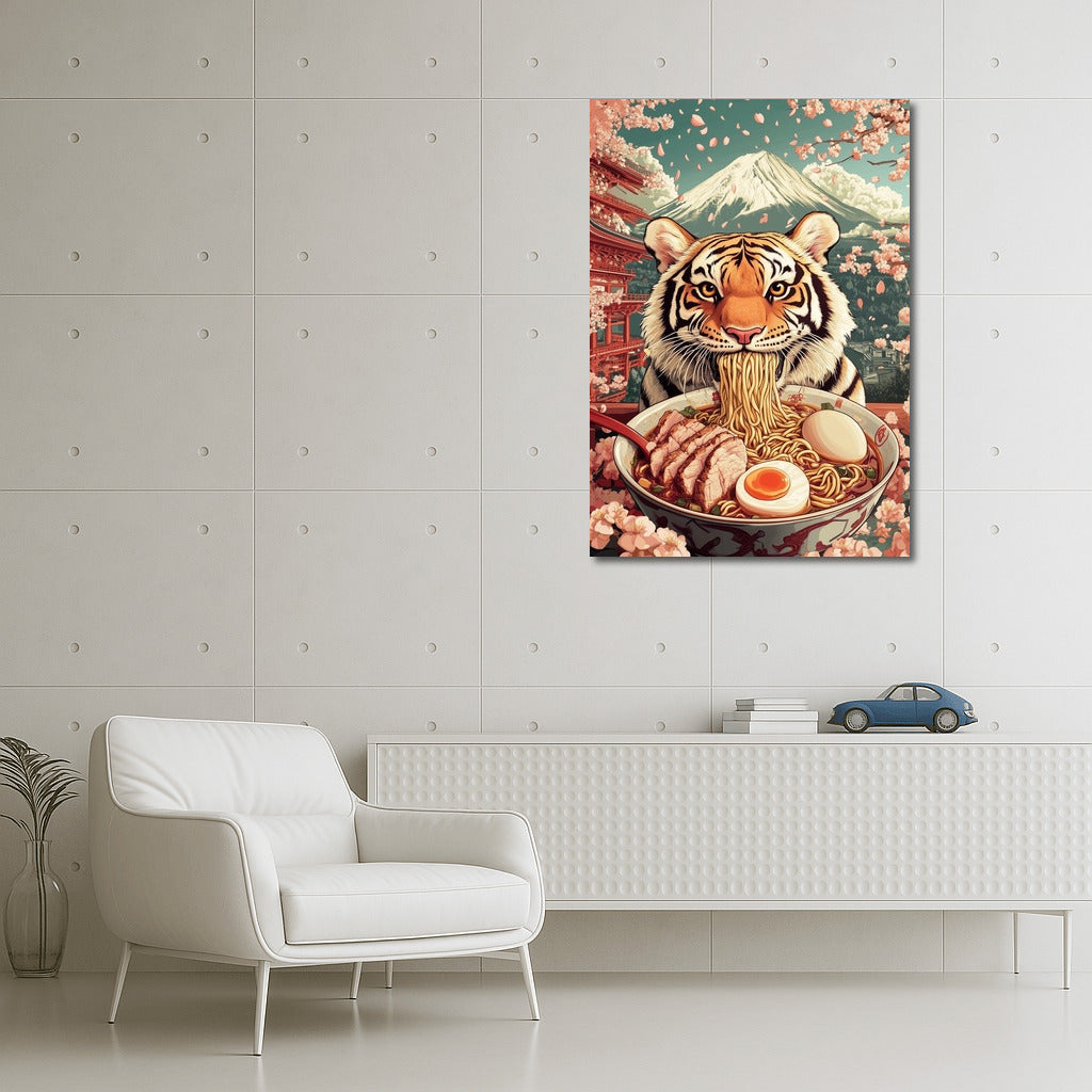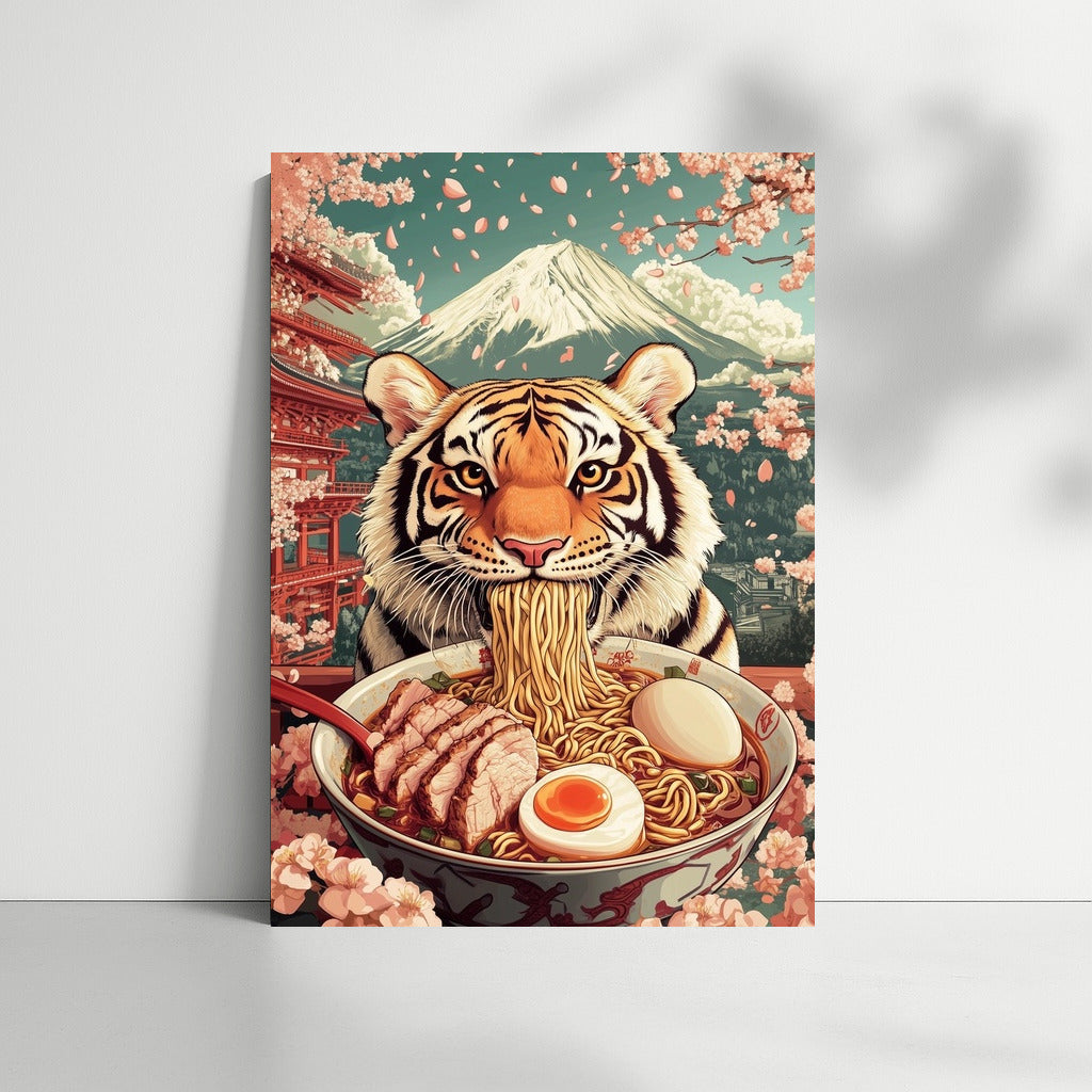 Tiger enjoys ramen against the backdrop of sakura and Fuji. The poster will enliven your interior with bright accents and exotic charm! See more from the collection: Animals Art