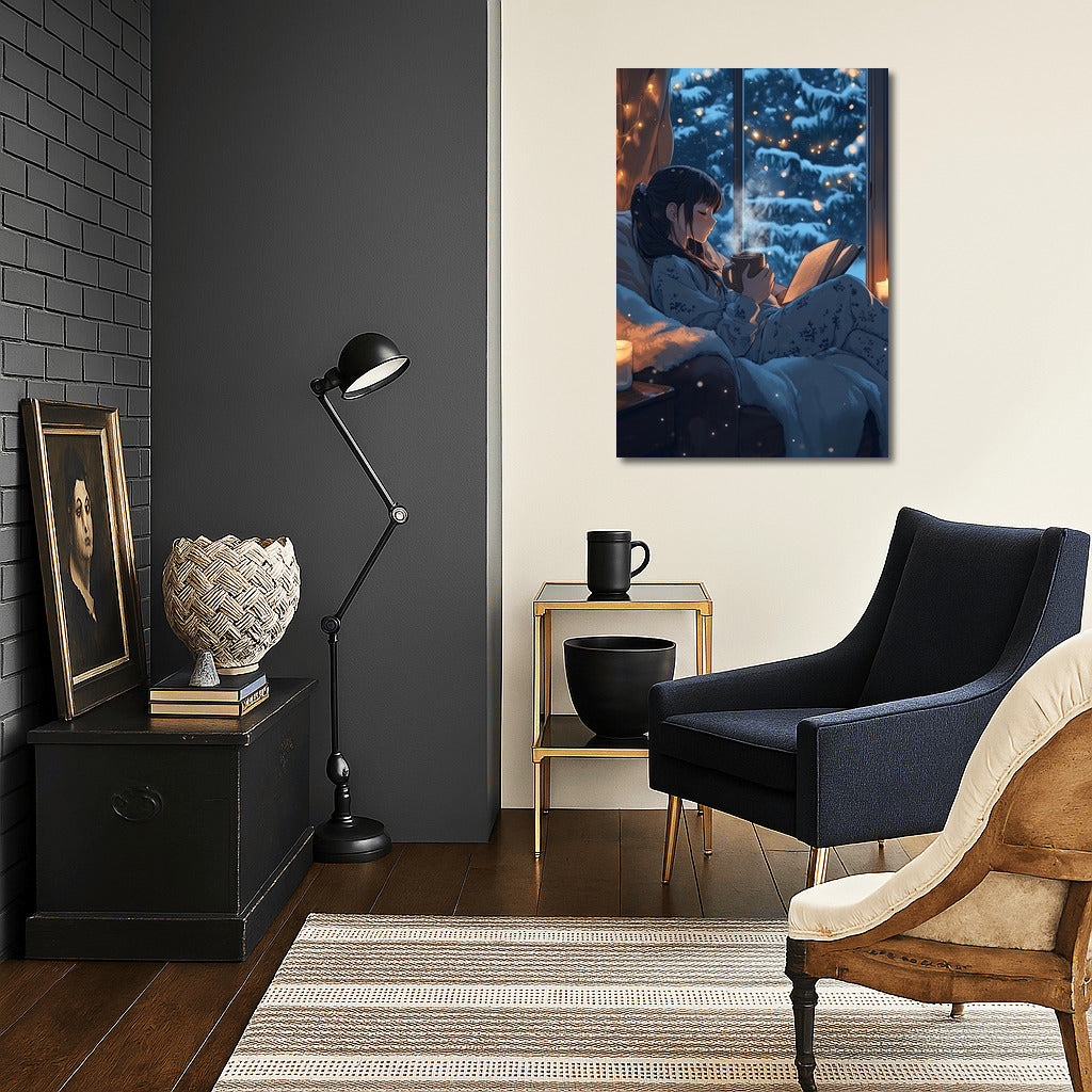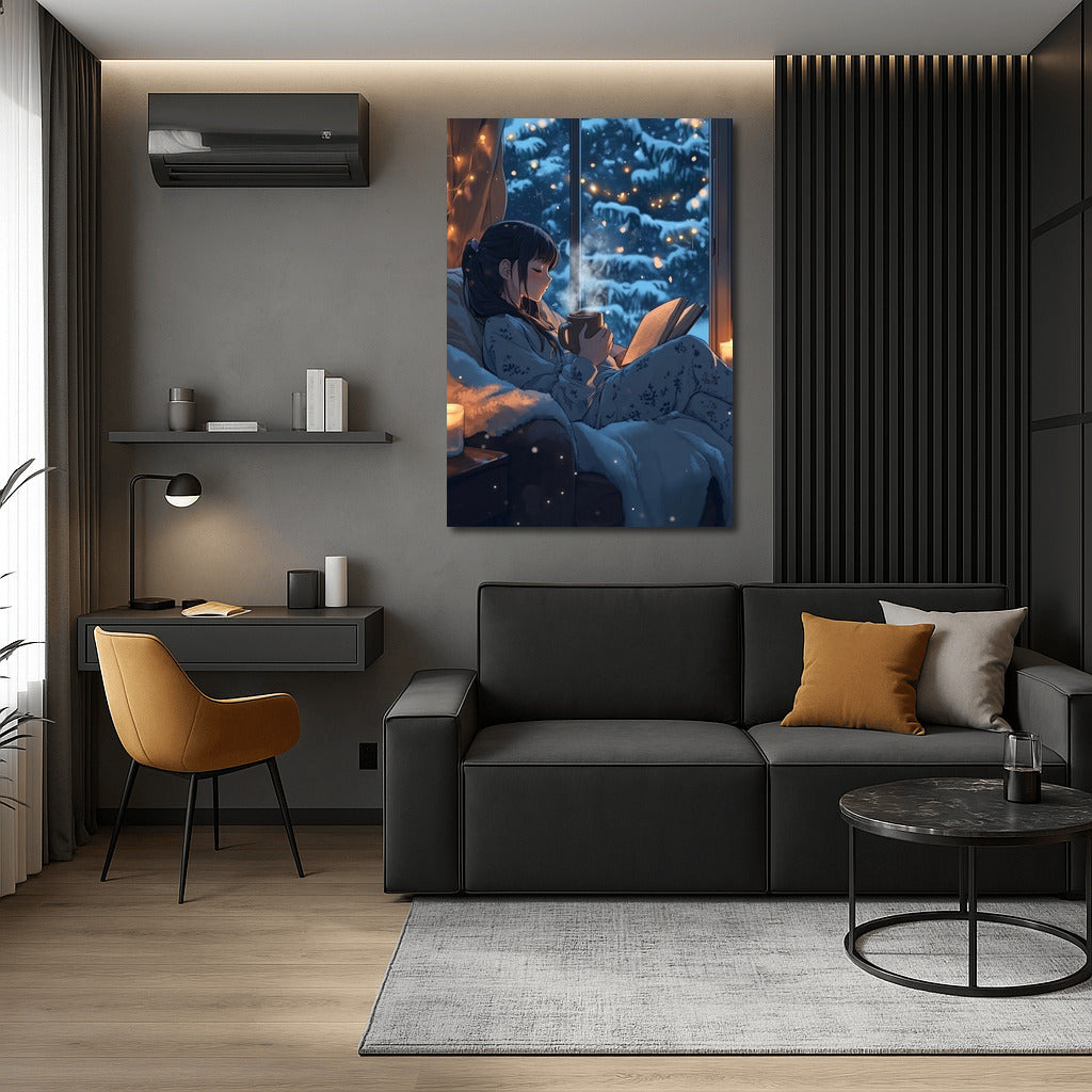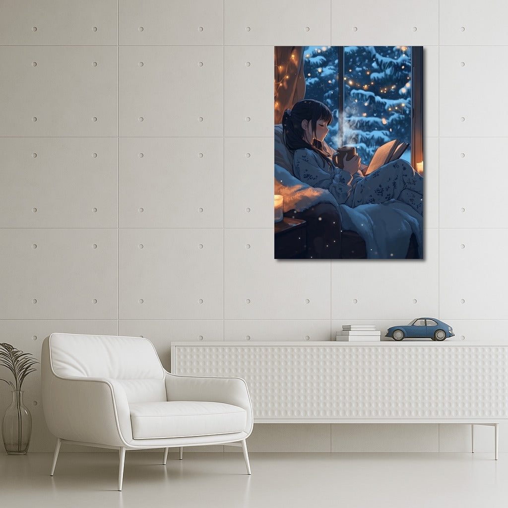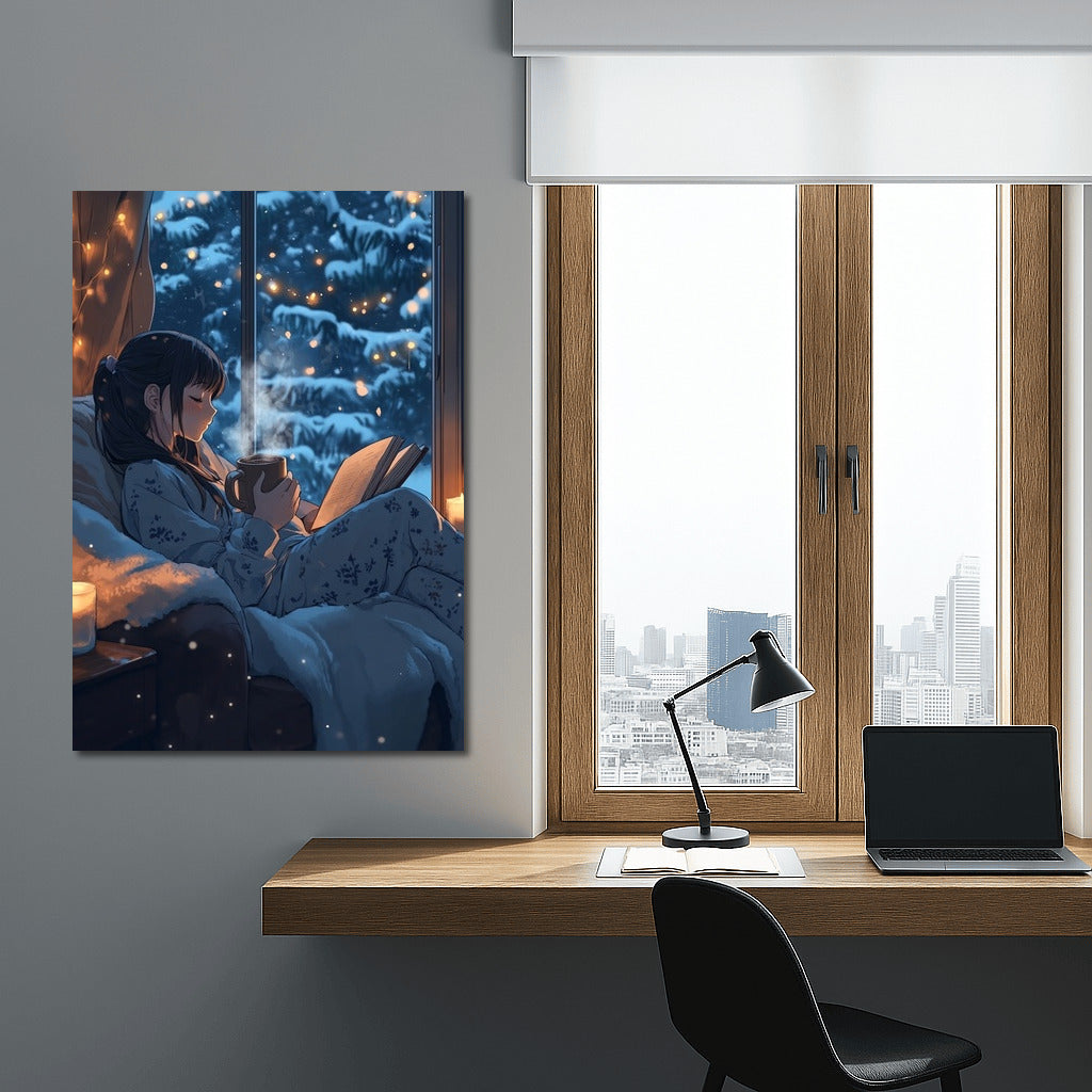 Winter evening coziness: poster of a tender moment of reading by the window, surrounded by a snowy landscape and the magic of lights. Wall art. See more from the collection: Anime & Manga genres Art