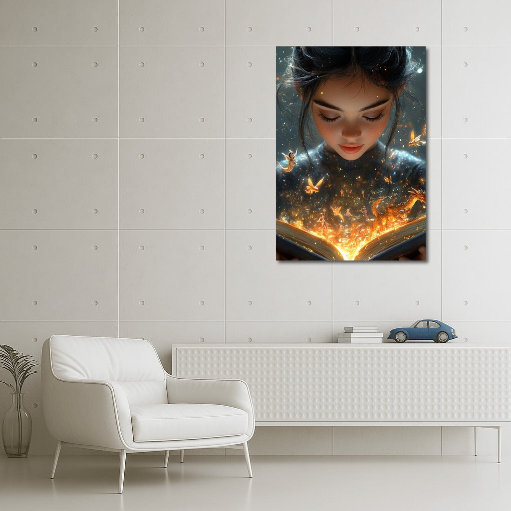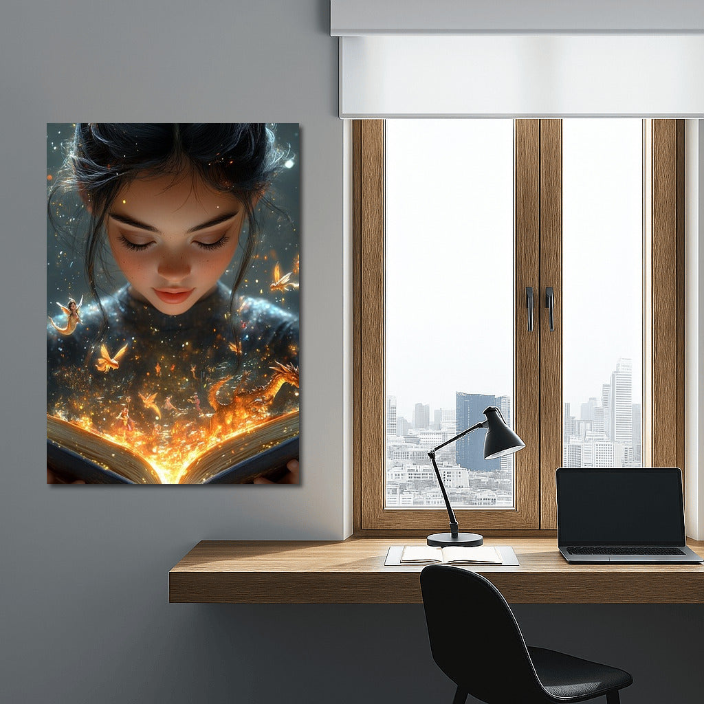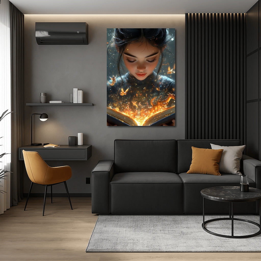 Open a world of fantasy with this painting: a girl immersed in the magic of a book, flying fairies come to life on your walls. ✨? See more from the collection: Wall Art with Women
