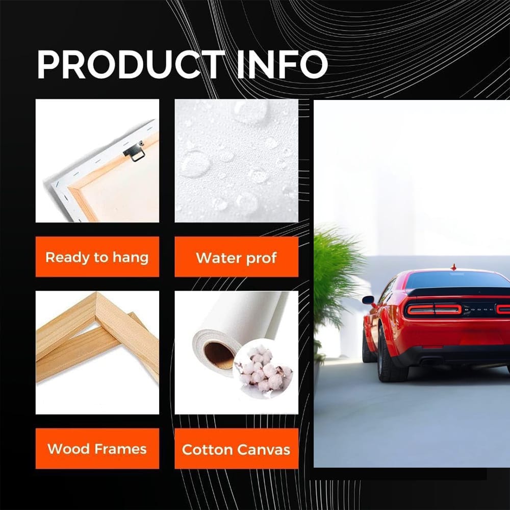 This poster is like a top-end crash! The red beast, Dodge Challenger, seems to have flown off the strip straight onto the wall. A painting for those who live at high speeds. Wall art that charges with adrenaline and reminds: speed is life. See more from the collection: Dodge Art