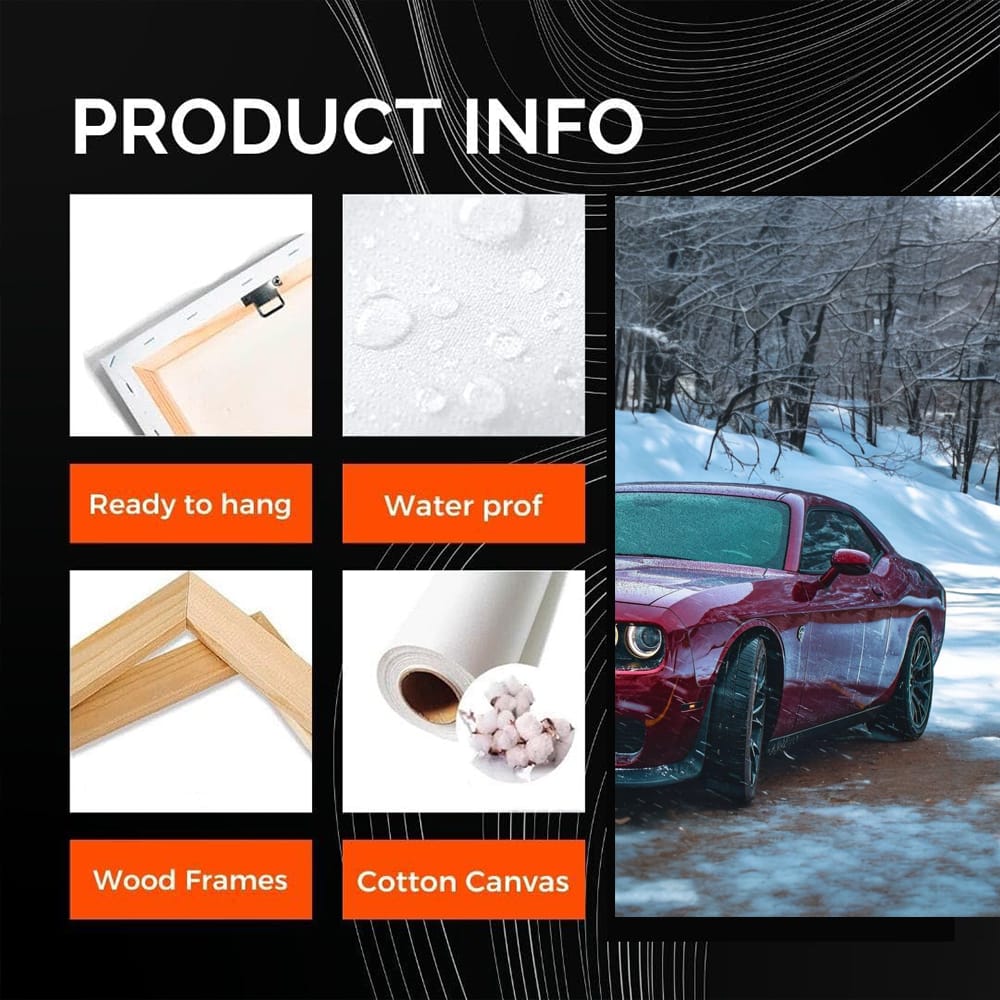 This painting is pure adrenaline on the wall! The red Dodge rushes through the snow storm like an animal on the hunt. Wall art for those who live on the edge and are not afraid of speed. This poster is the perfect companion for the garage of a true car fan! See more from the collection: Dodge Art