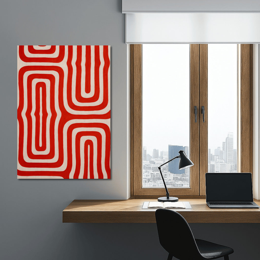 A maze of lines and the silence of red. This minimalist painting will add style and depth to your interior. Wall art. See more from the collection: Minimalism Art