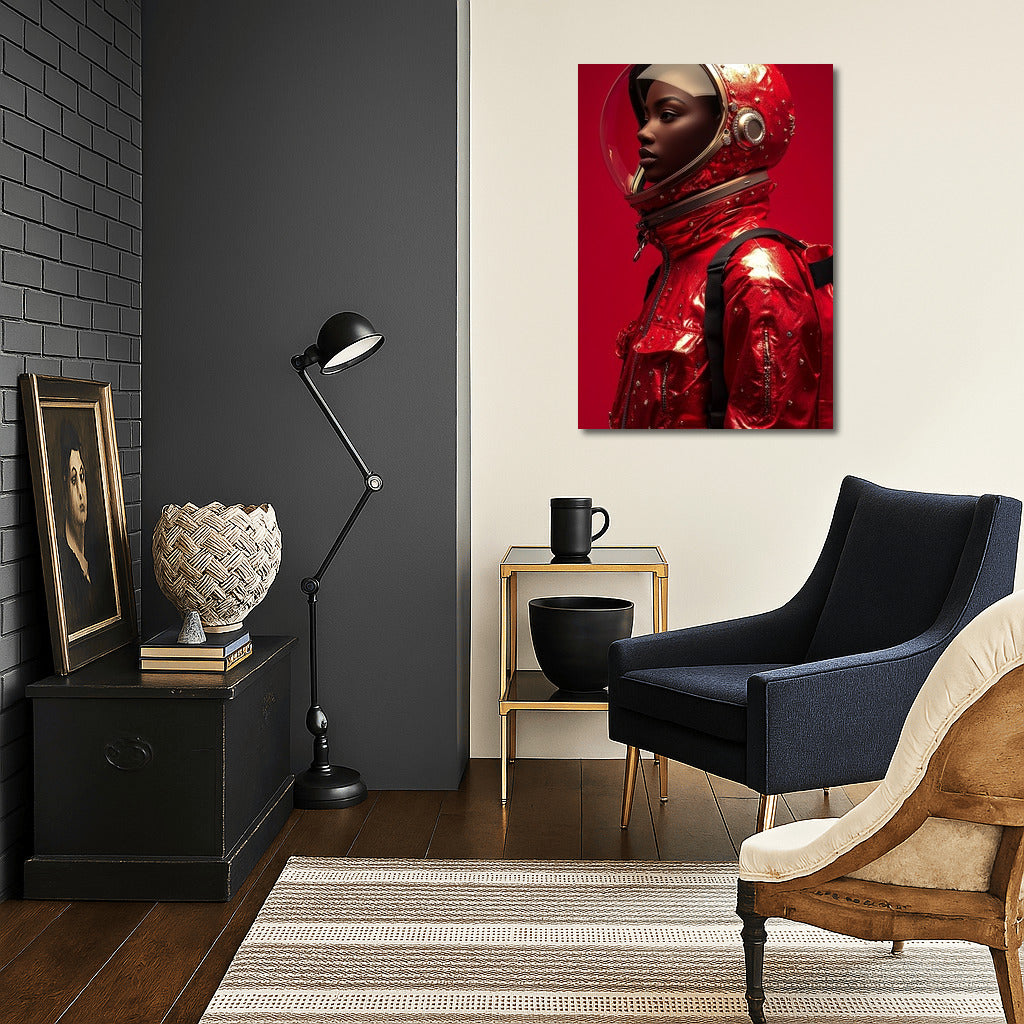 Explore space and style with this vibrant wall art featuring a mysterious figure in a striking red spacesuit against a cosmic backdrop. See more from the collection: Wall Art with Women