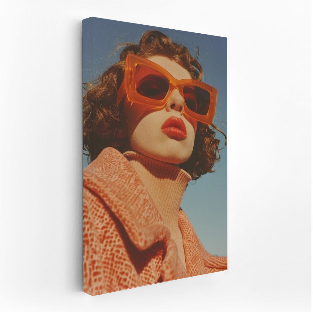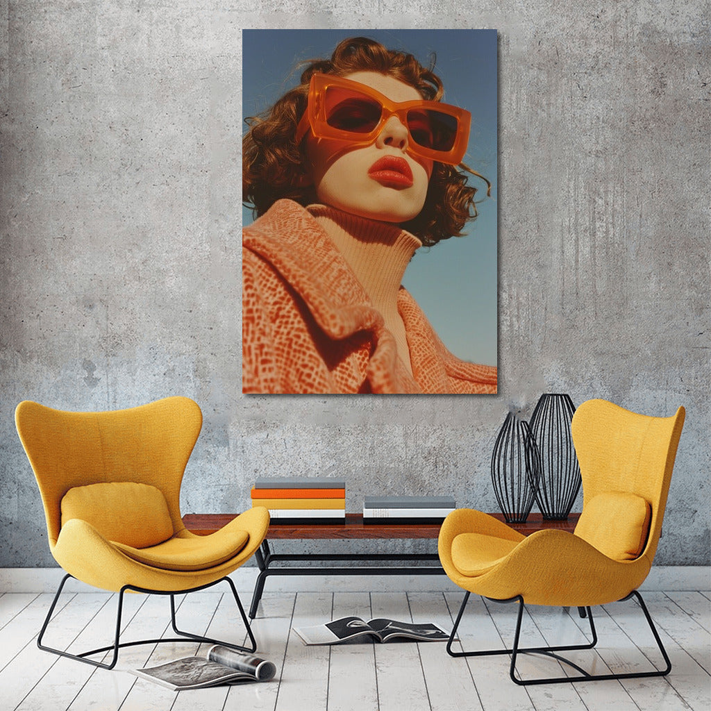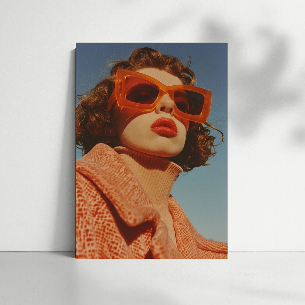 A vibrant painting of a girl in stylish glasses. This poster will add daring and uniqueness to your wall art. See more from the collection: Wall Art with Women