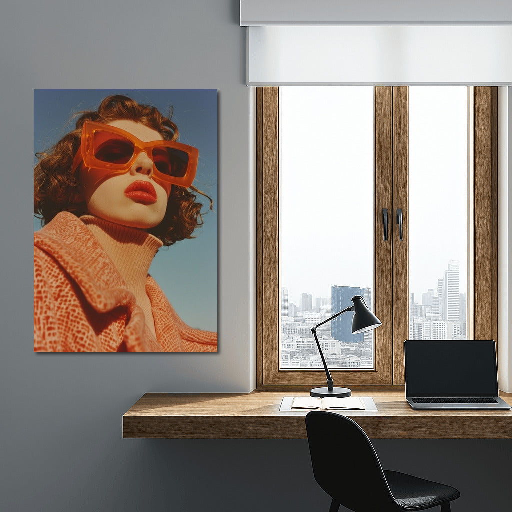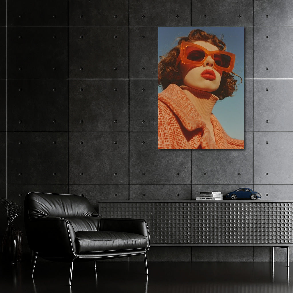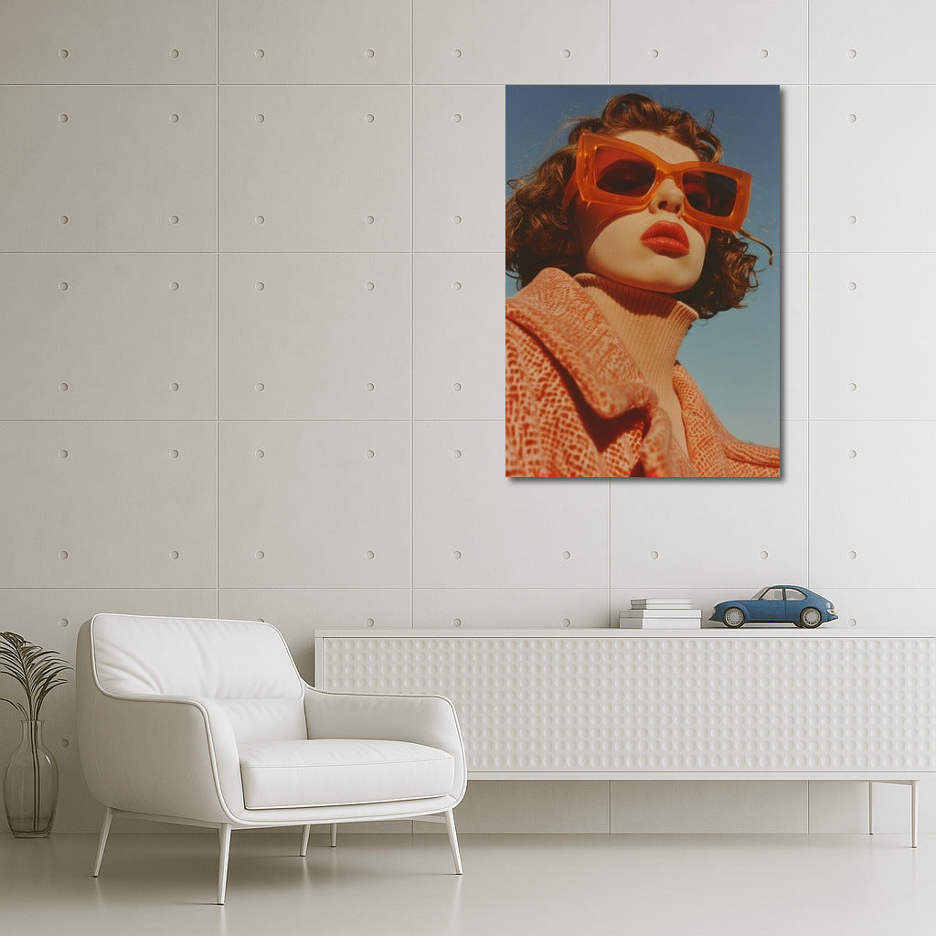 A vibrant painting of a girl in stylish glasses. This poster will add daring and uniqueness to your wall art. See more from the collection: Wall Art with Women