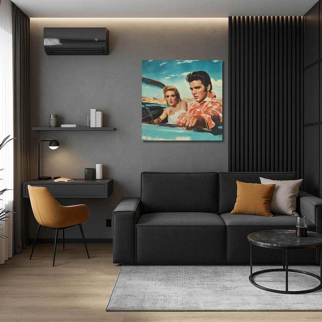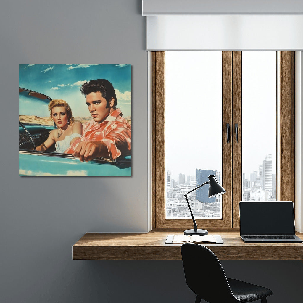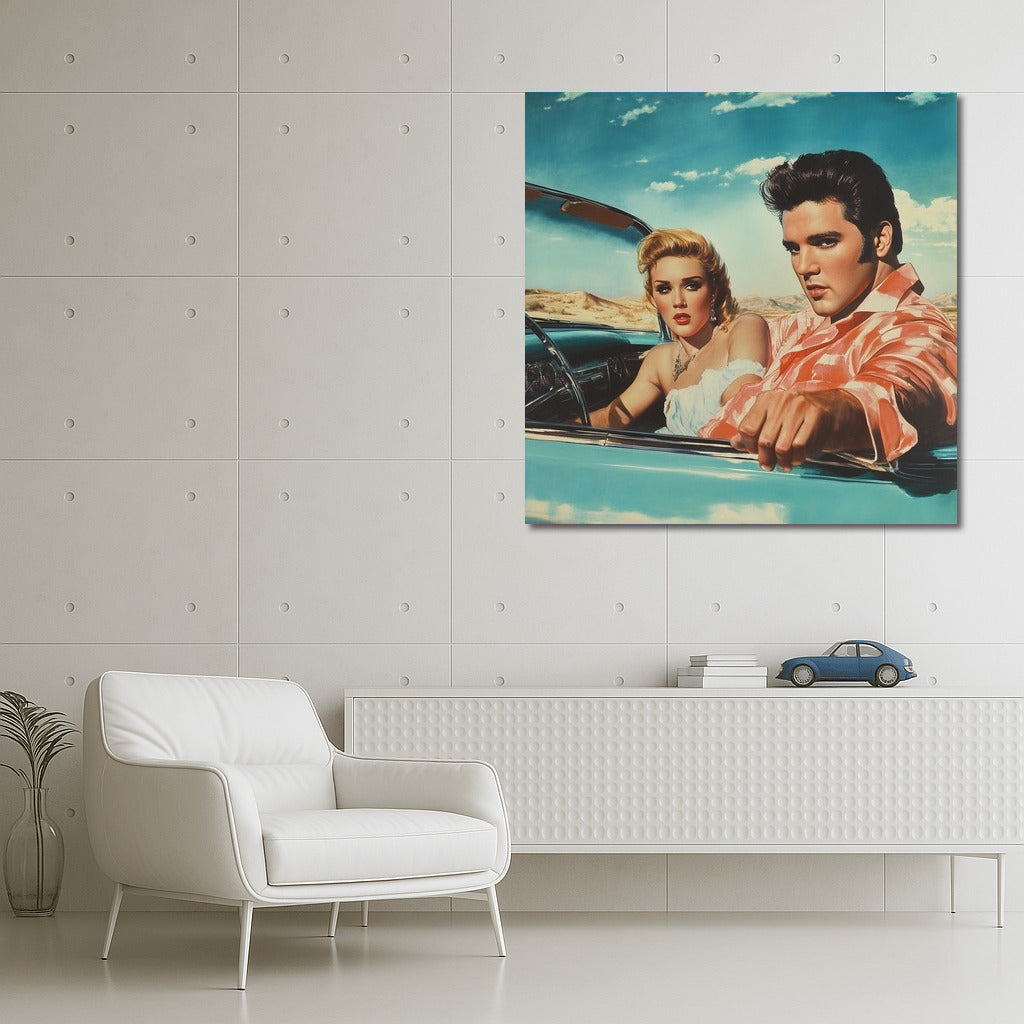 Enjoy retro charm with this poster of a mysterious couple traveling in a classic car through a desert landscape. Wall art. See more from the collection: Mixed Wall Art