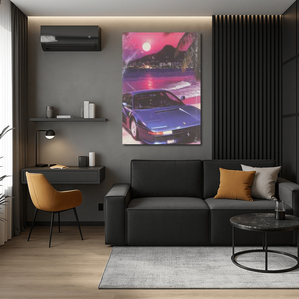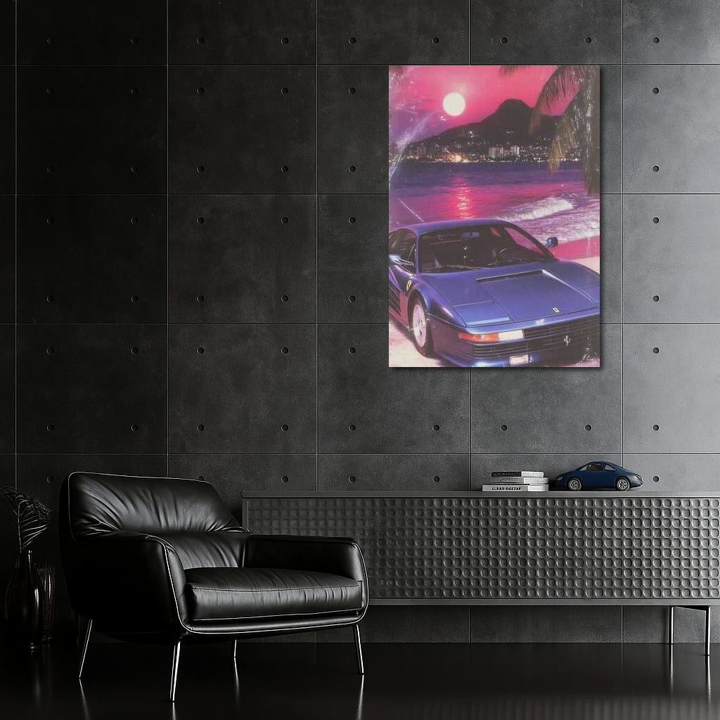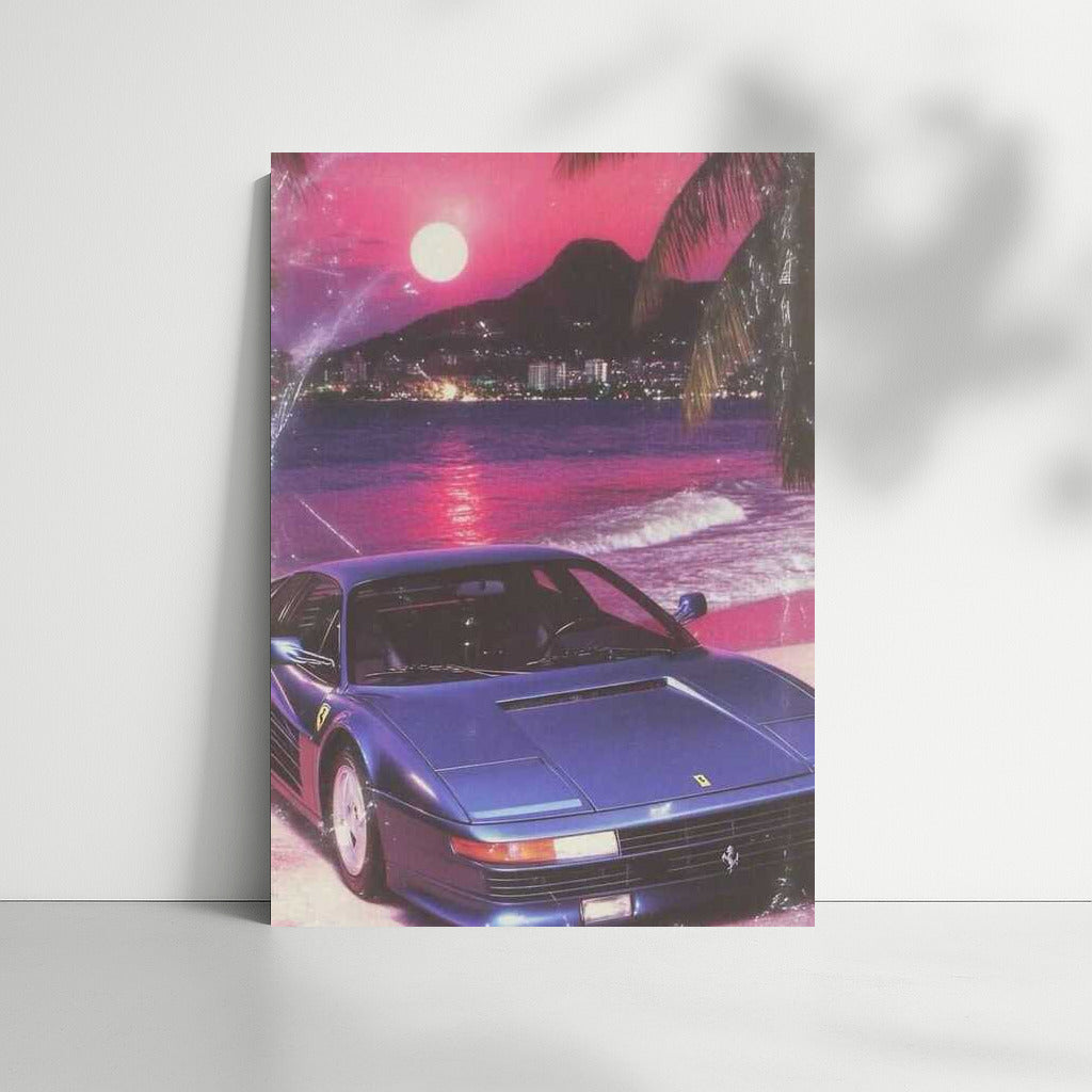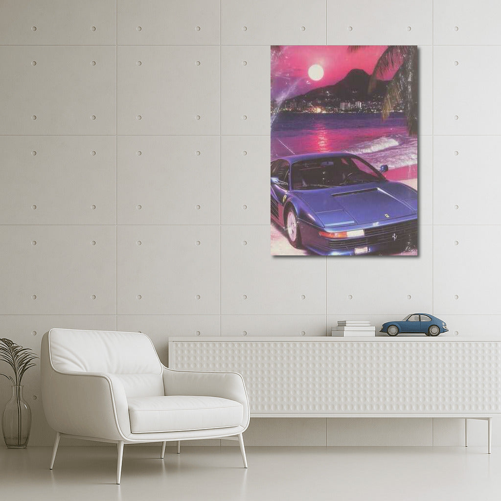 A vibrant poster in Retro 80S Nostalgia style: Ferrari against a pink sunset and palm trees. Wall art that will liven up your interior. See more from the collection: Retro 80s & Nostalgia Art