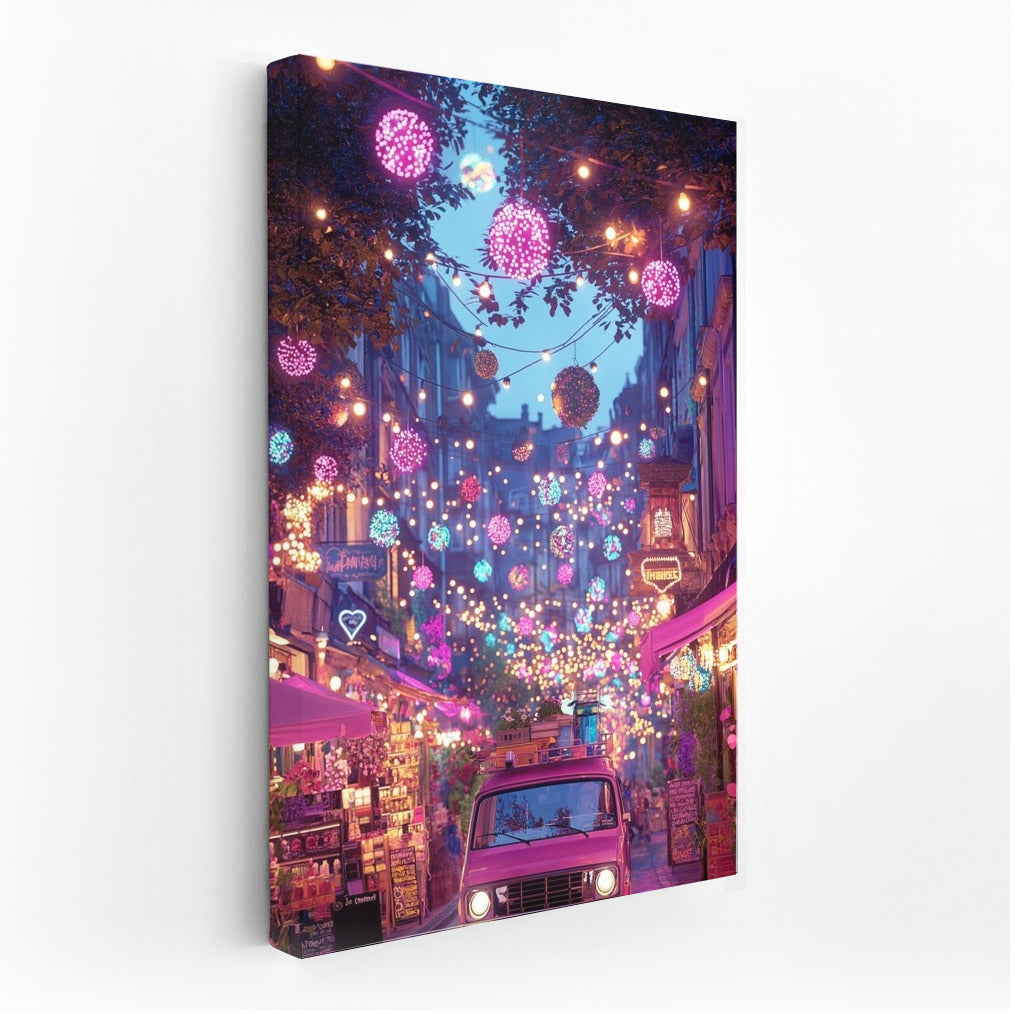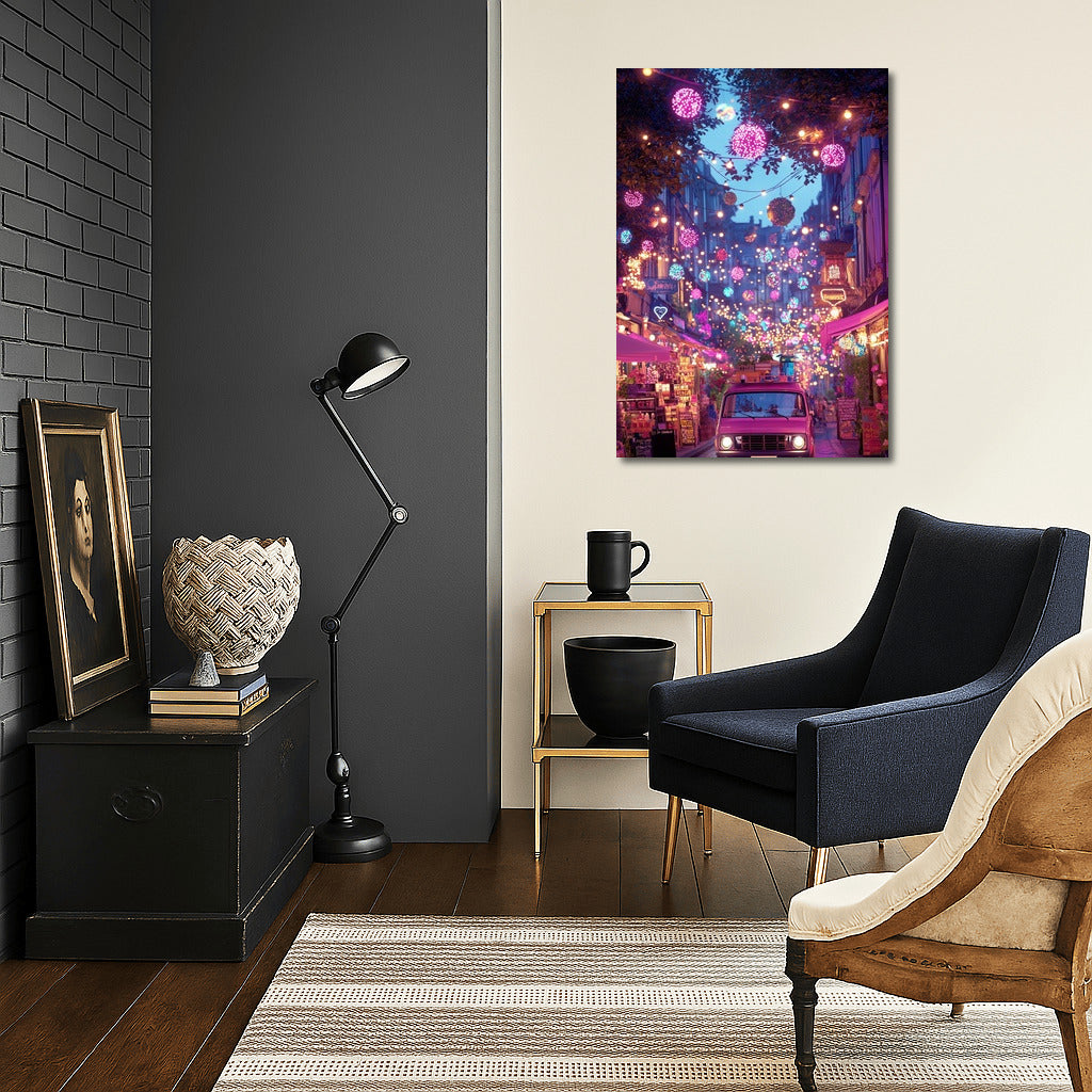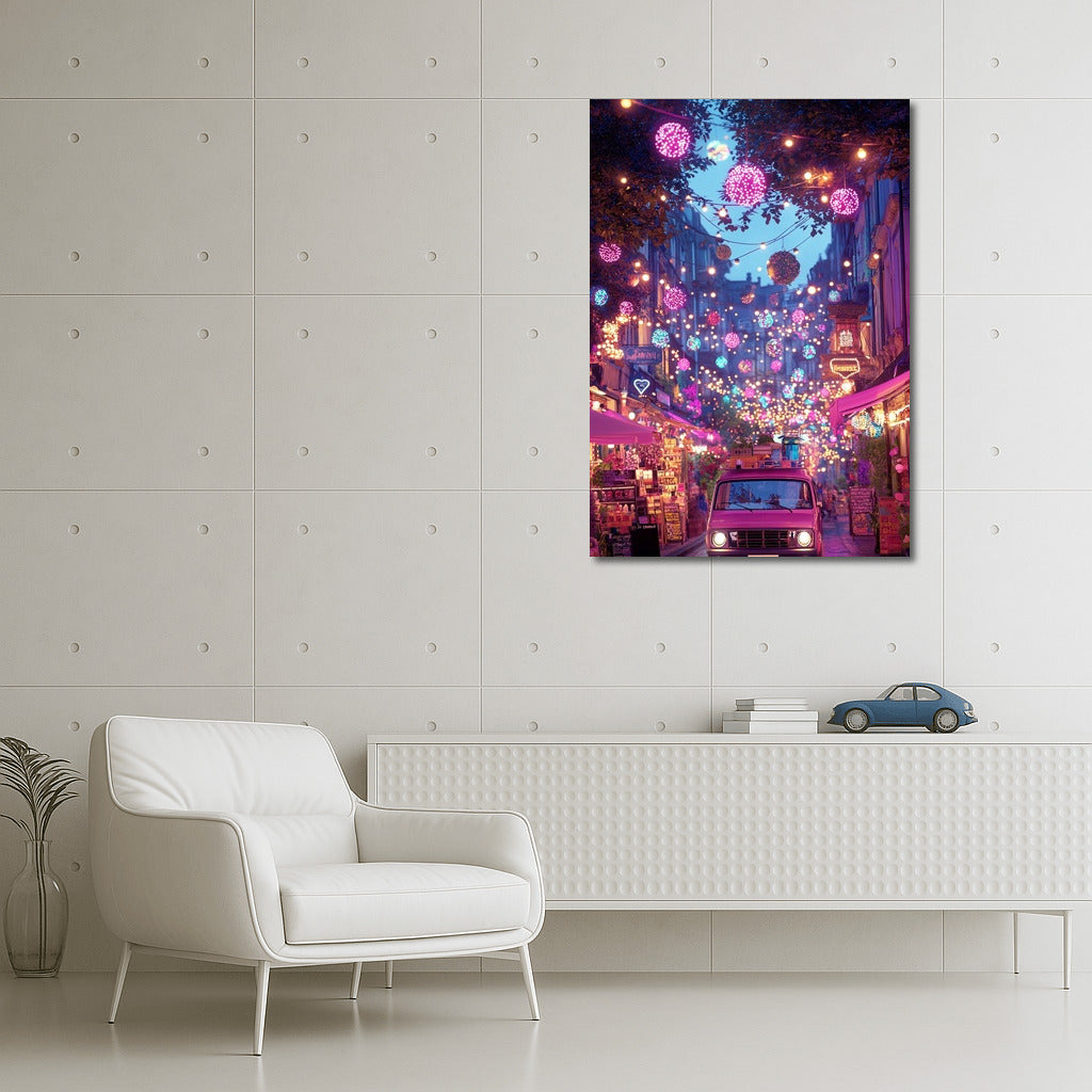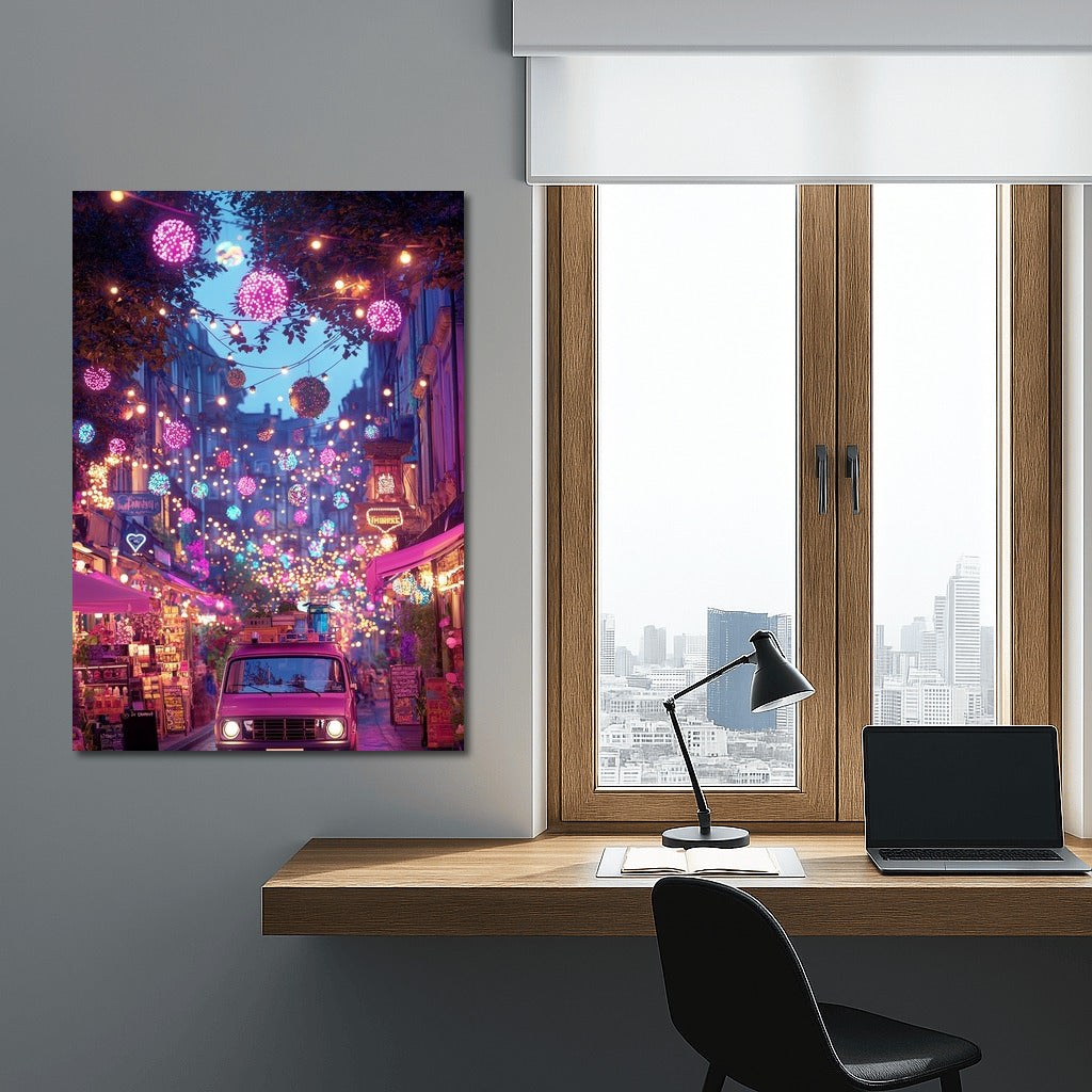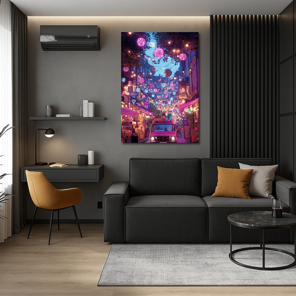 Cozy evening city, bright lights and retro van create magic on your poster. Wall art with a festive atmosphere! See more from the collection: City at Night Art