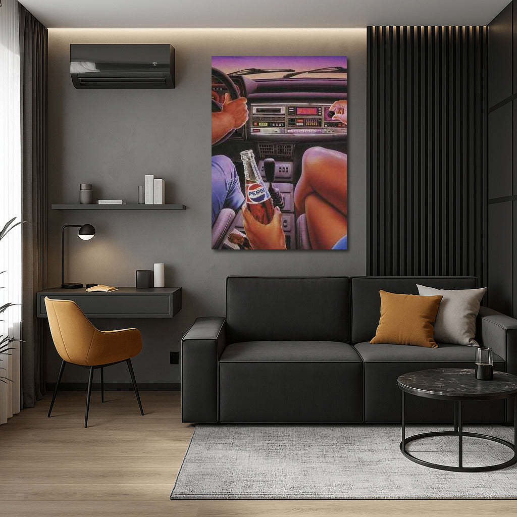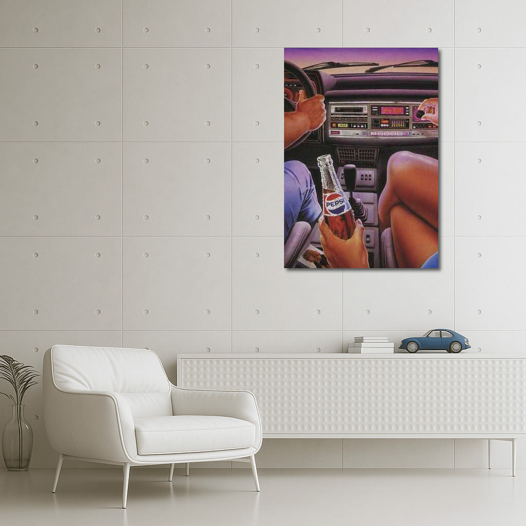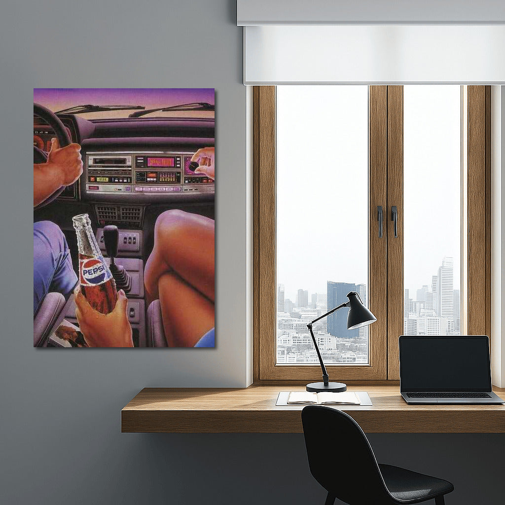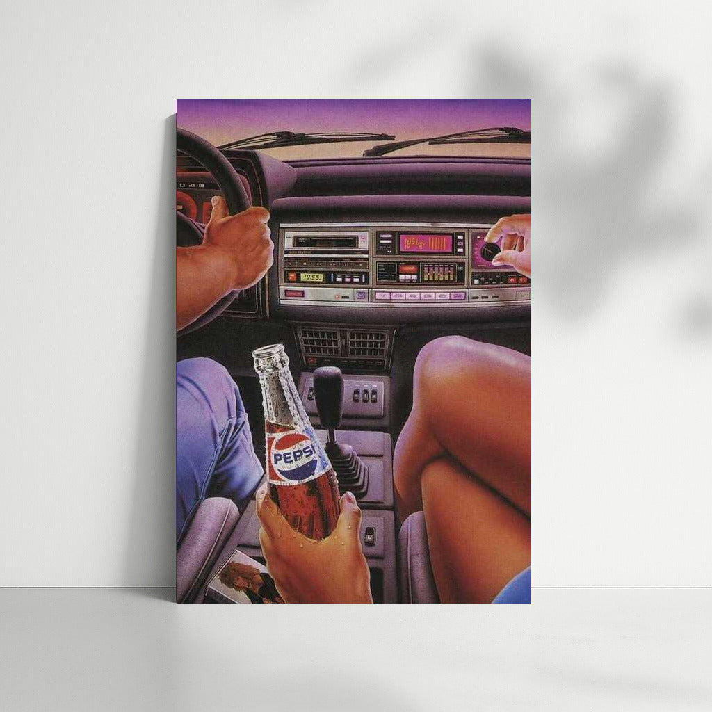Immerse yourself in the atmosphere of the 80s with this retro painting: car interior, drink and music - nostalgia on your wall! See more from the collection: Retro 80s & Nostalgia Art