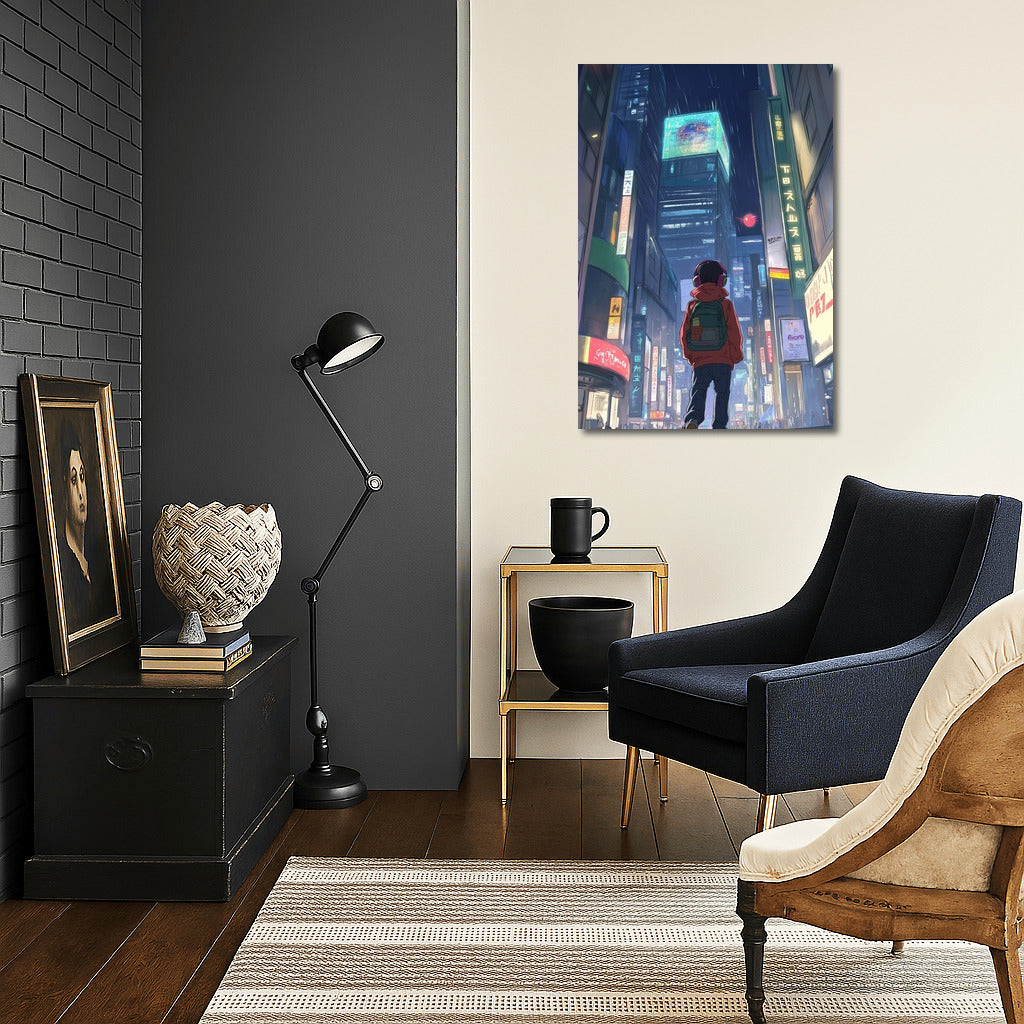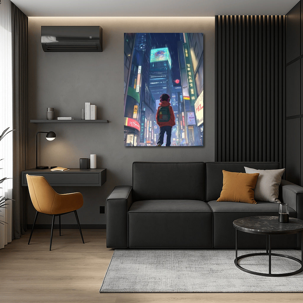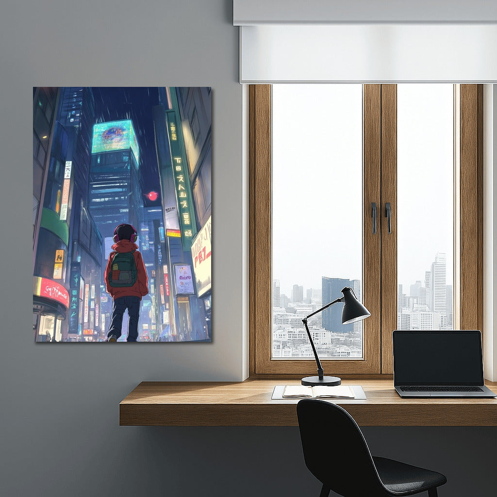 Neon metropolis and mysterious silhouette in headphones - plunge into the atmosphere of the future with this unique wall art poster. See more from the collection: Anime & Manga genres Art