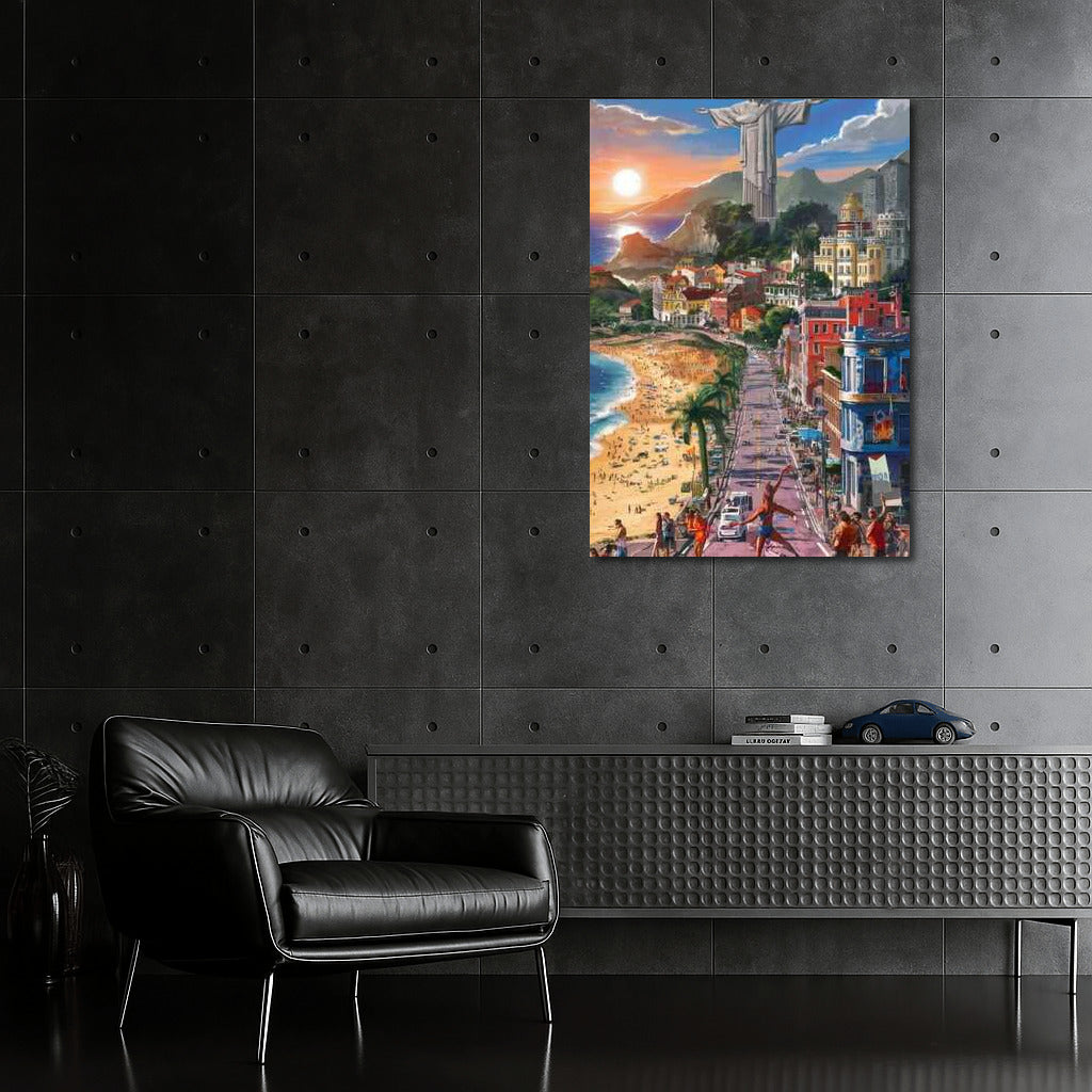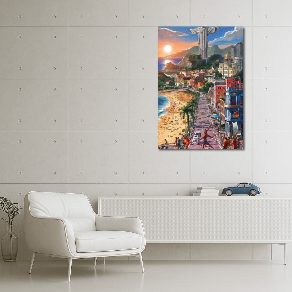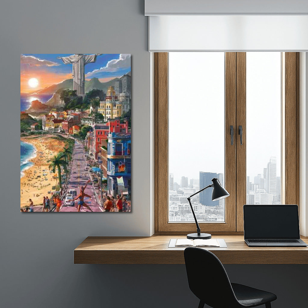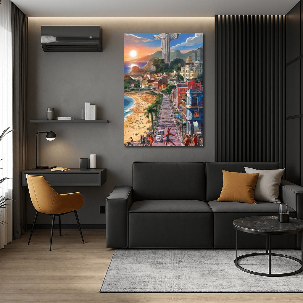 Immerse yourself in the vibrant rhythms of Brazil with this painting. The iconic view of Rio, embodied in breathtaking wall art. See more from the collection: Brazil Art