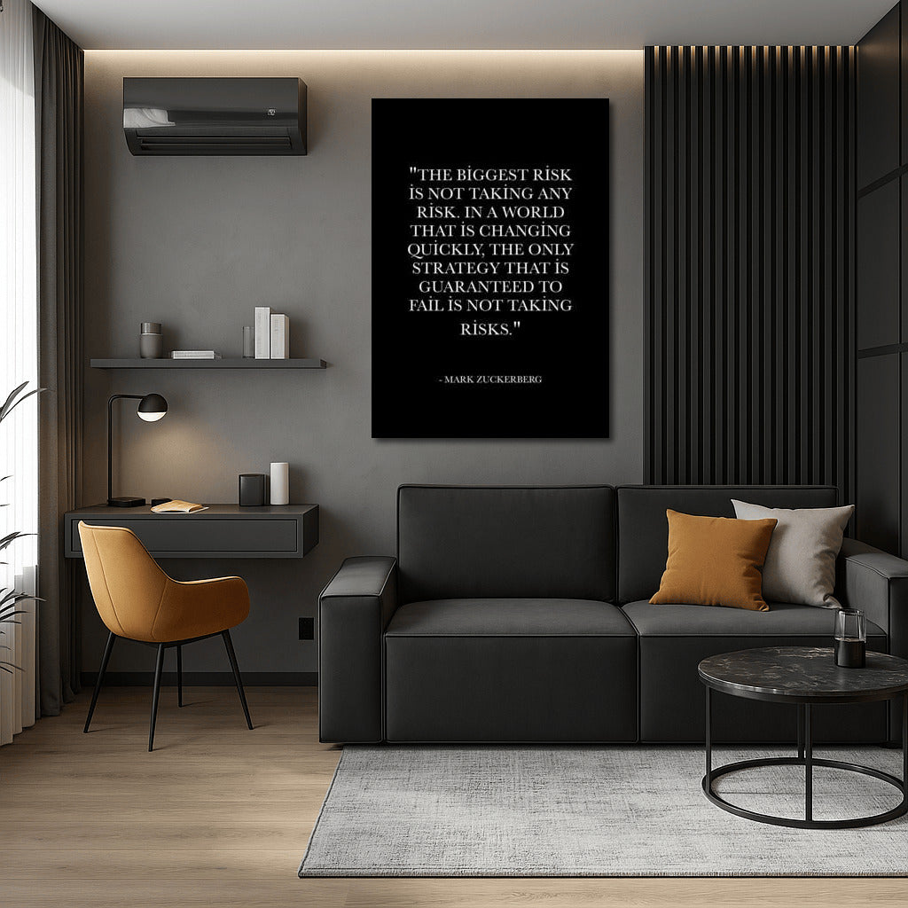 Wall art with a quote from Mark Zuckerberg: The biggest risk is not taking any risk. Inspiration and motivation in every day! See more from the collection: Inspirational & Motivational Quotes Art