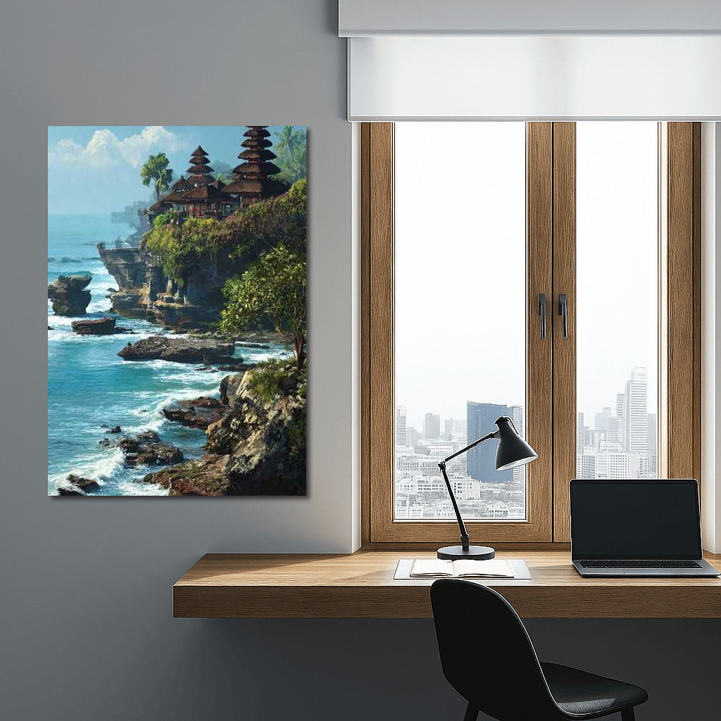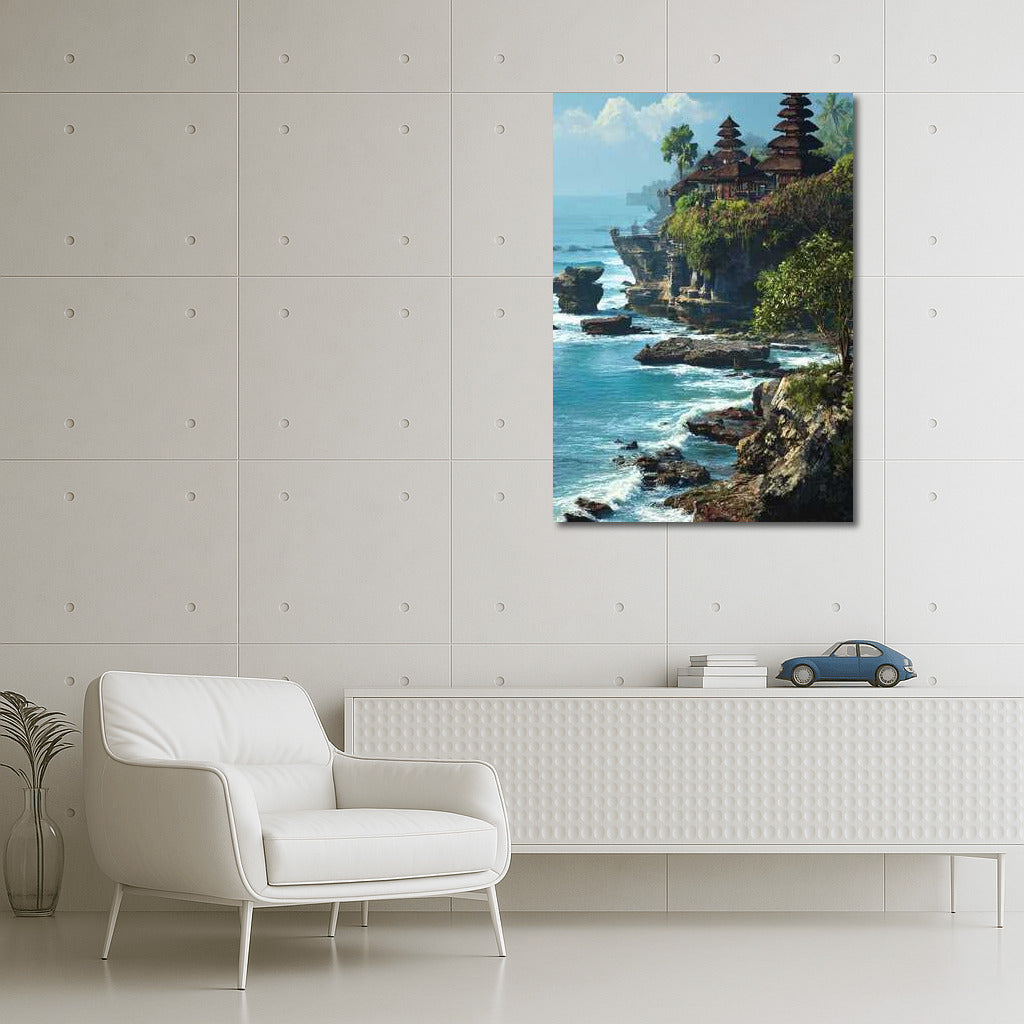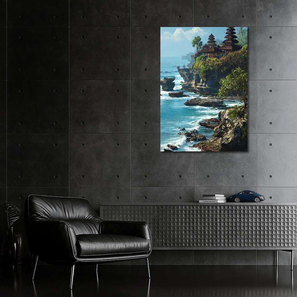 An exotic painting of the rocky shores and temples of Indonesia. A beautiful poster that will be the highlight of your wall art. See more from the collection: Country Art