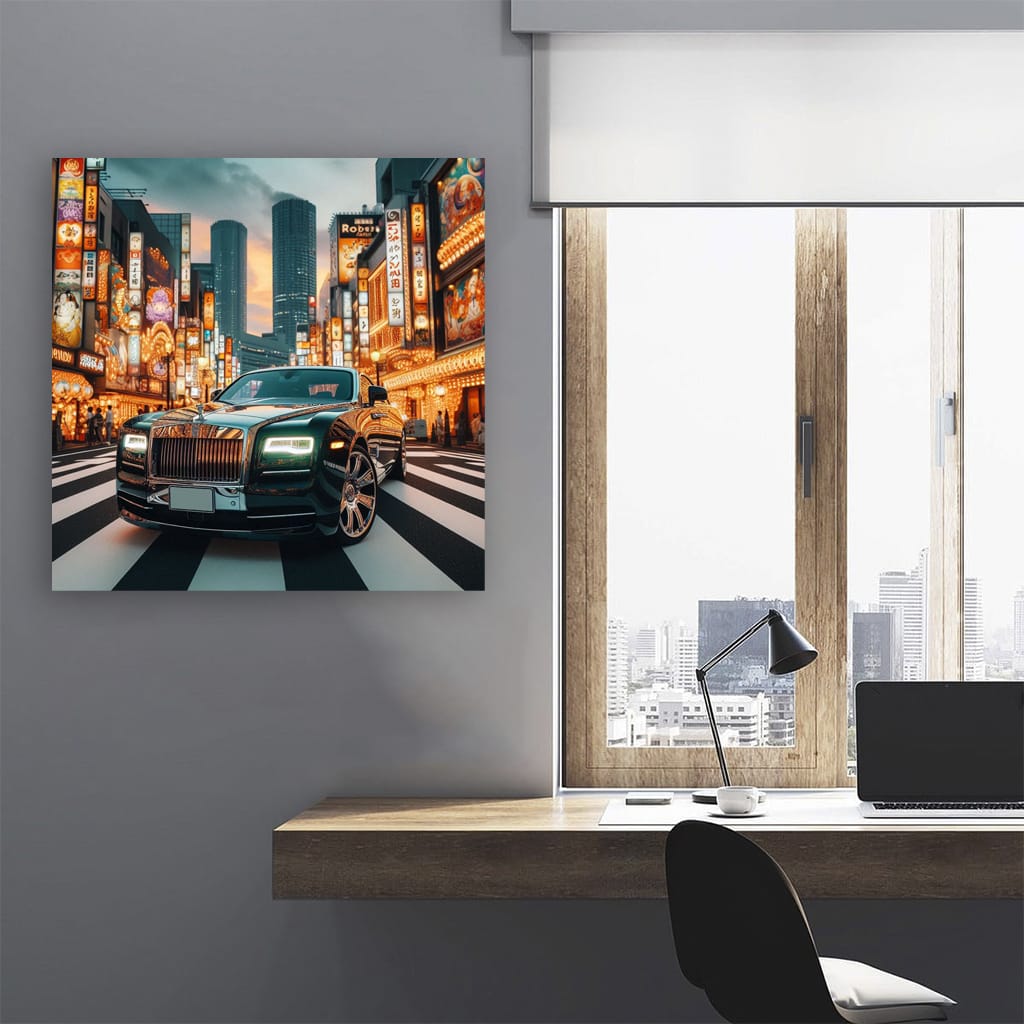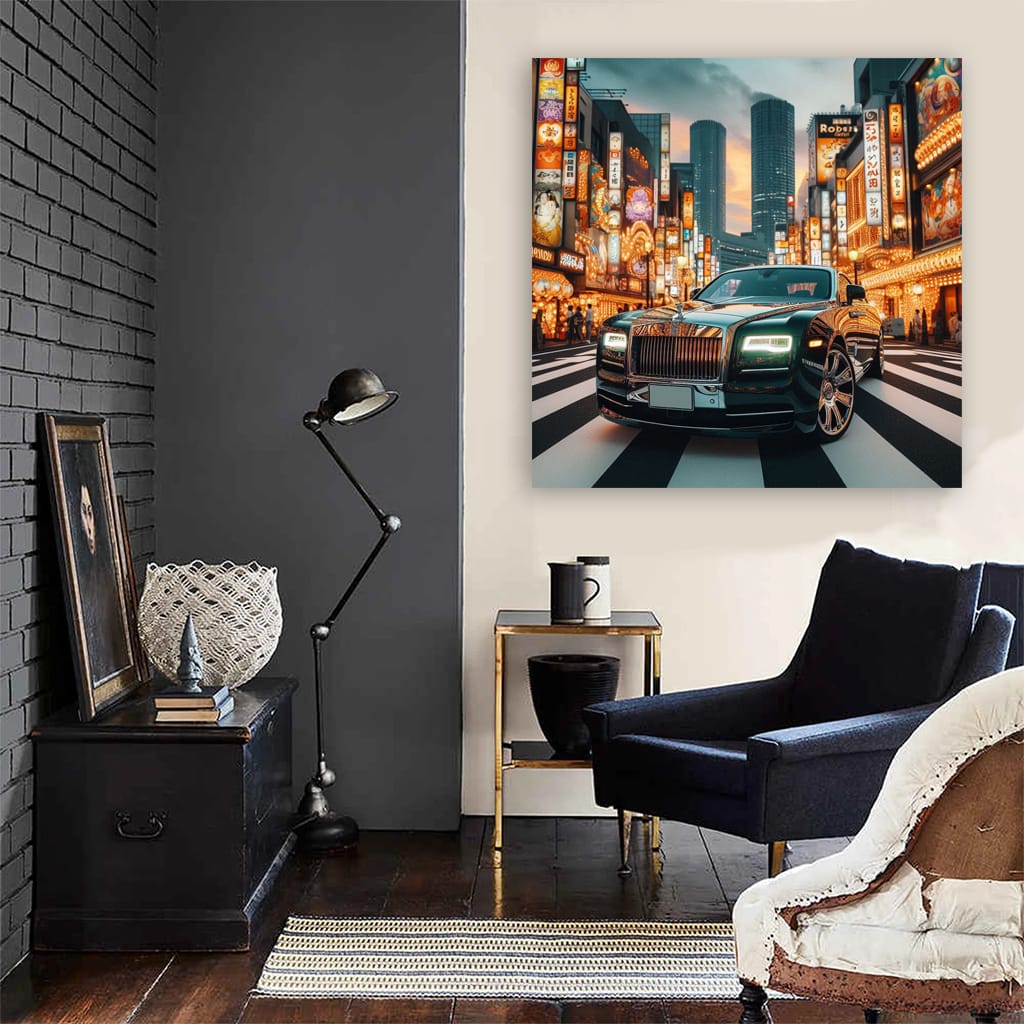 This poster is like a shot of adrenaline: a Rolls-Royce against the backdrop of the bright lights of Tokyo. Wall art for those who live in the fast lane. A painting for walls where the roar of engines and the shine of chrome are the main characters. This is not just decor, but a lifestyle. See more from the collection: Rolls Royce Art