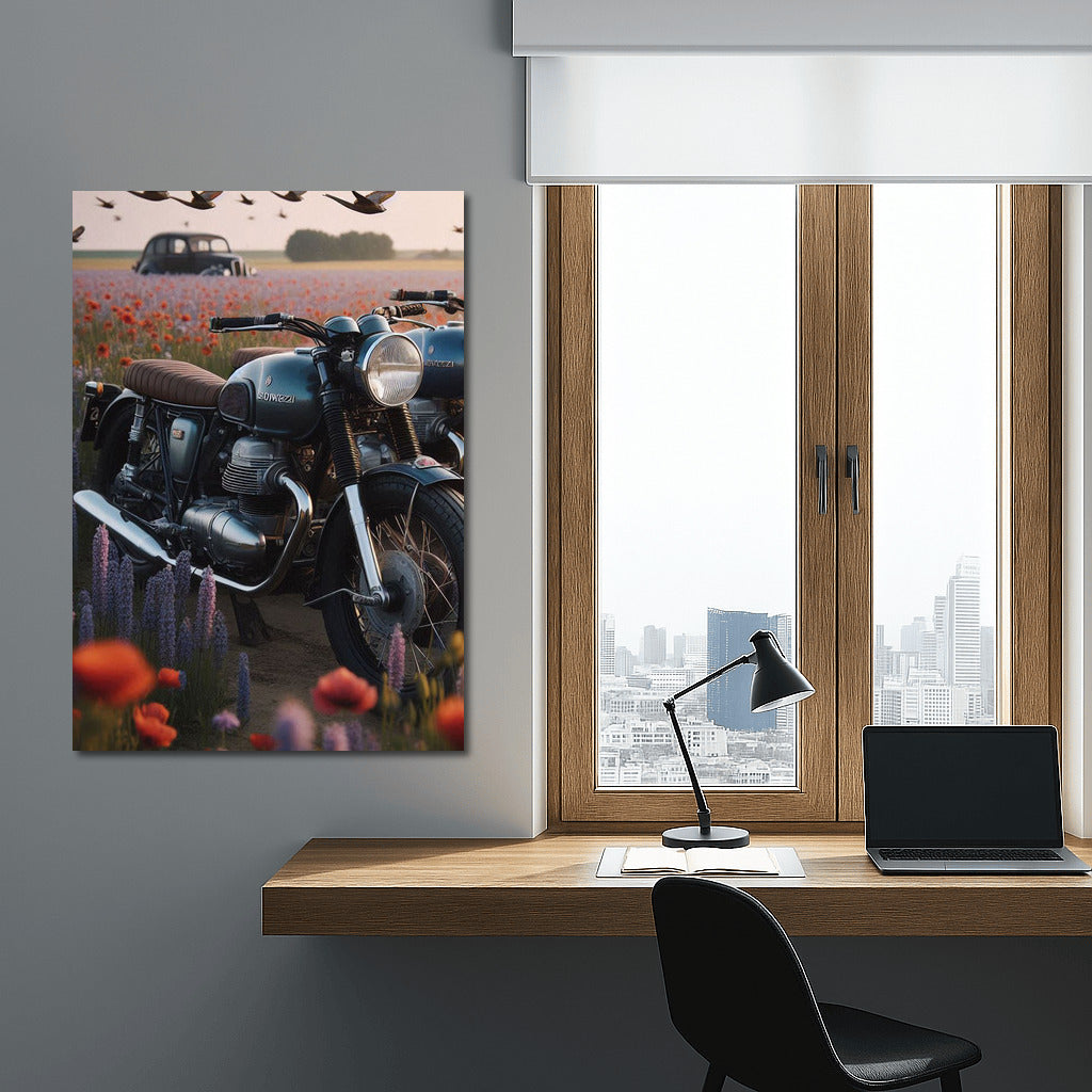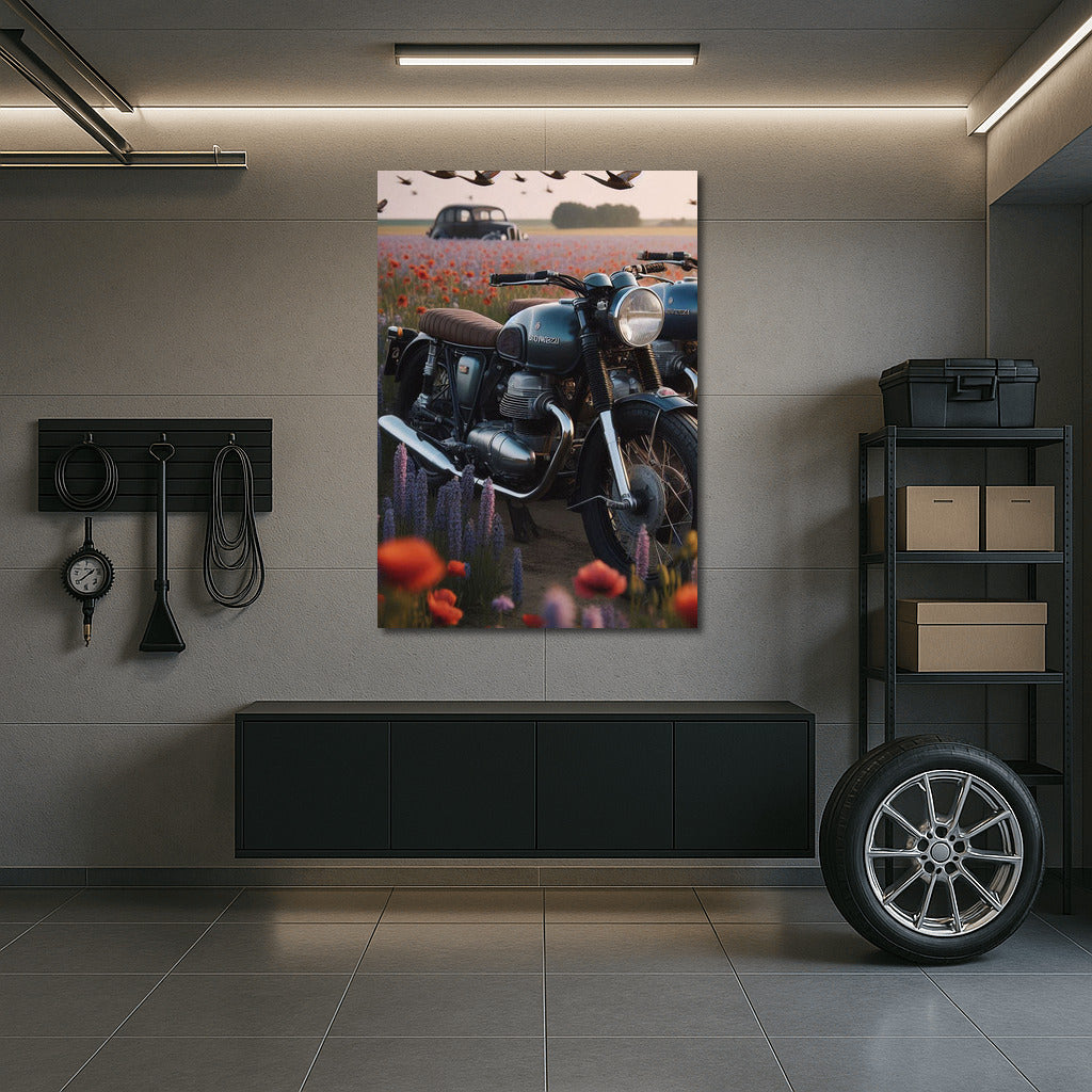 Moto Guzzi in a flower field - a poster where romance and speed meet in artistic harmony. Wall art for dreamers! See more from the collection: Moto Guzzi Motorcycle Art