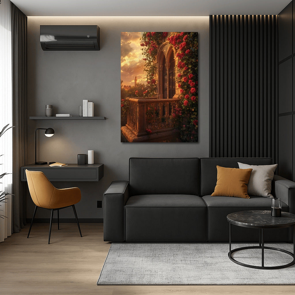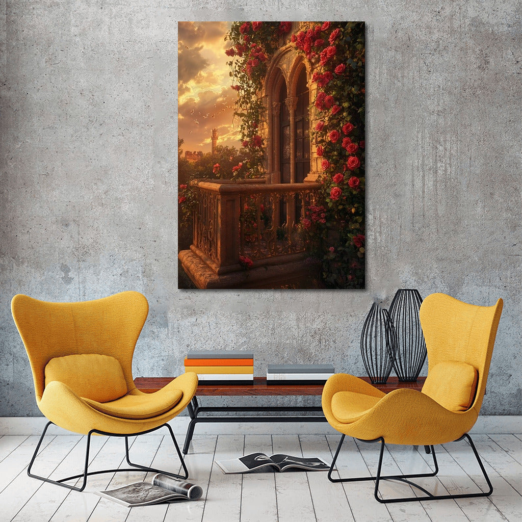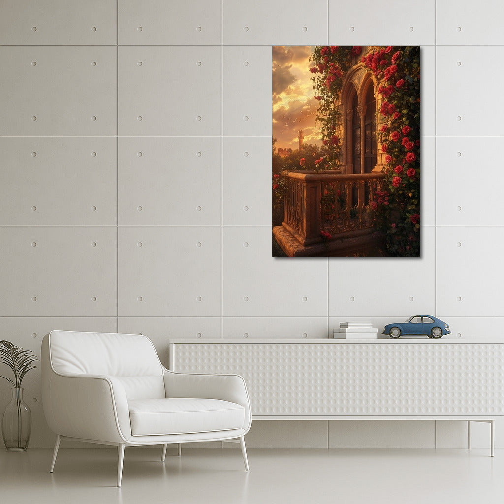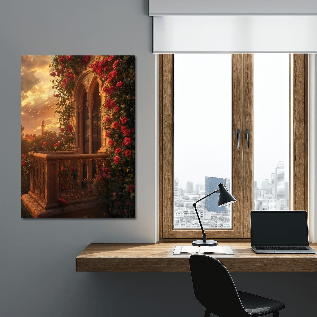 Magical sunset light and a riot of roses on an old balcony. This painting is the perfect wall art for romantics. See more from the collection: Mixed Wall Art
