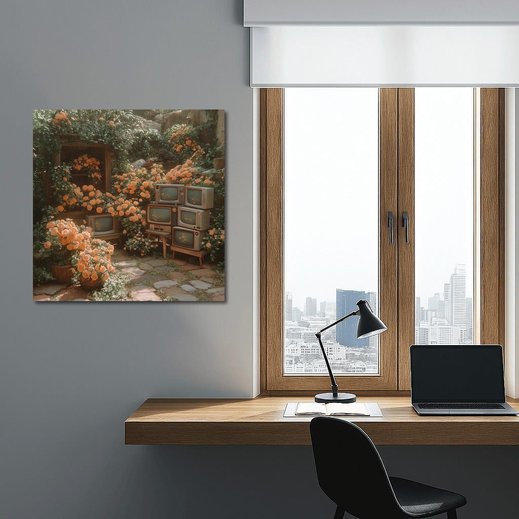 Dive into a retro fairy tale: a poster with a fantasy garden and old TVs wrapped in blooming roses. Dream wall art! See more from the collection: Mixed Wall Art