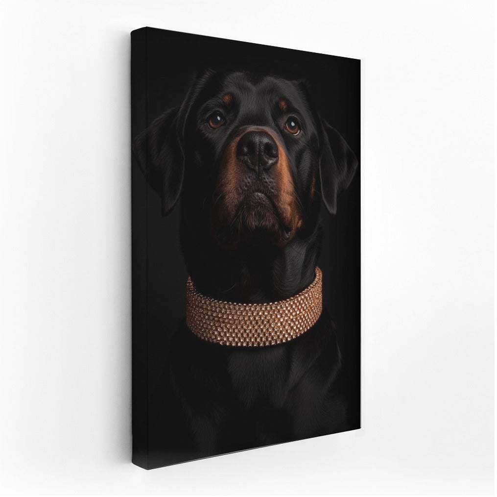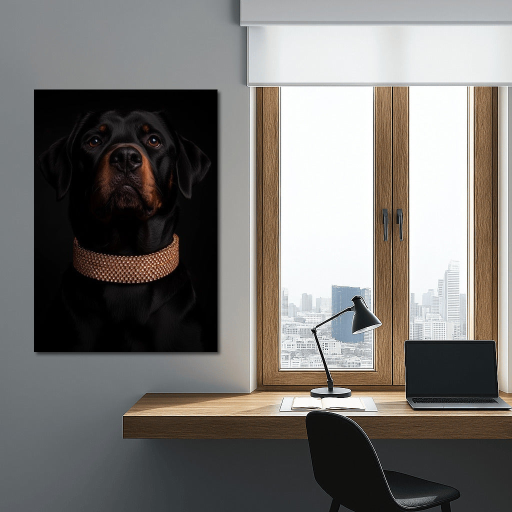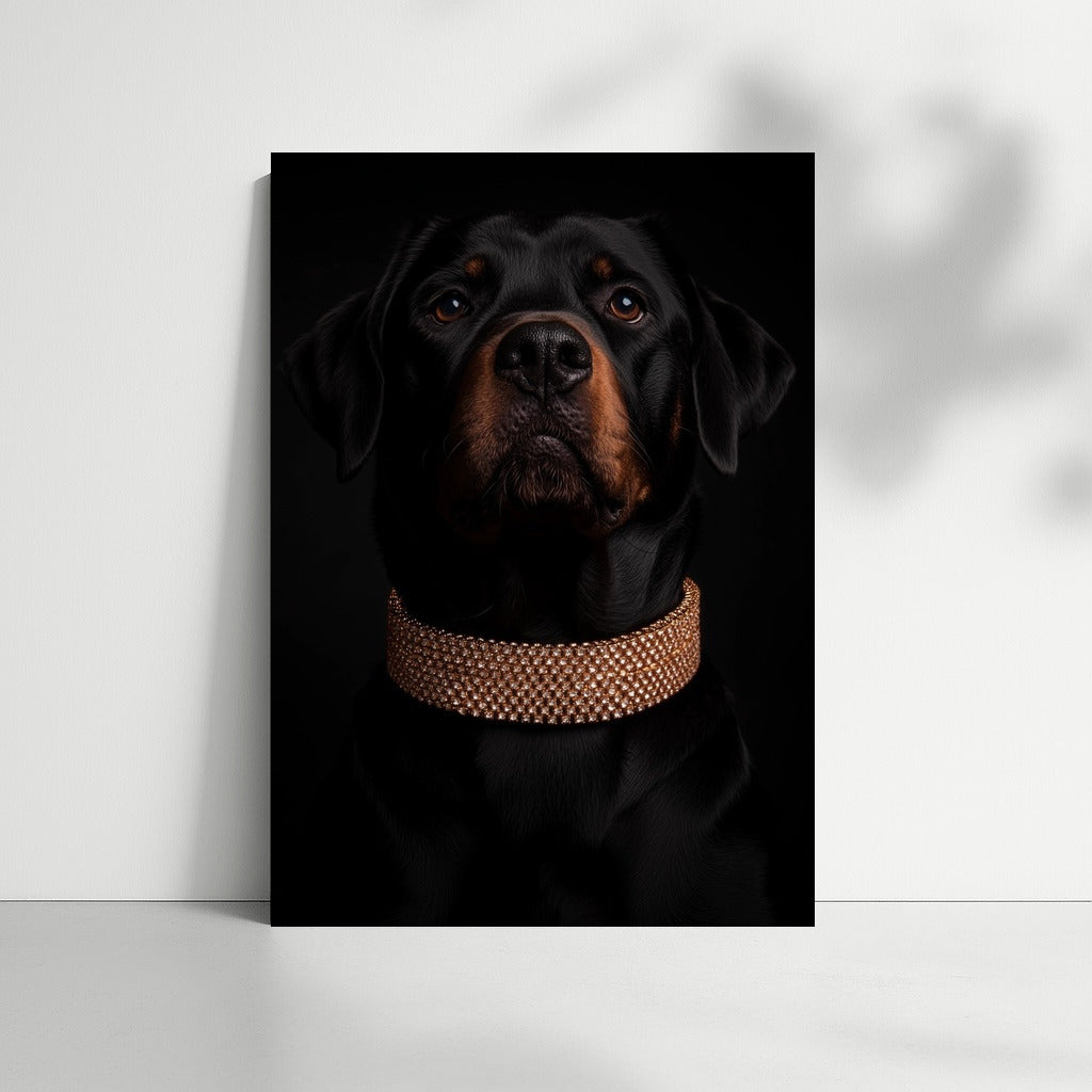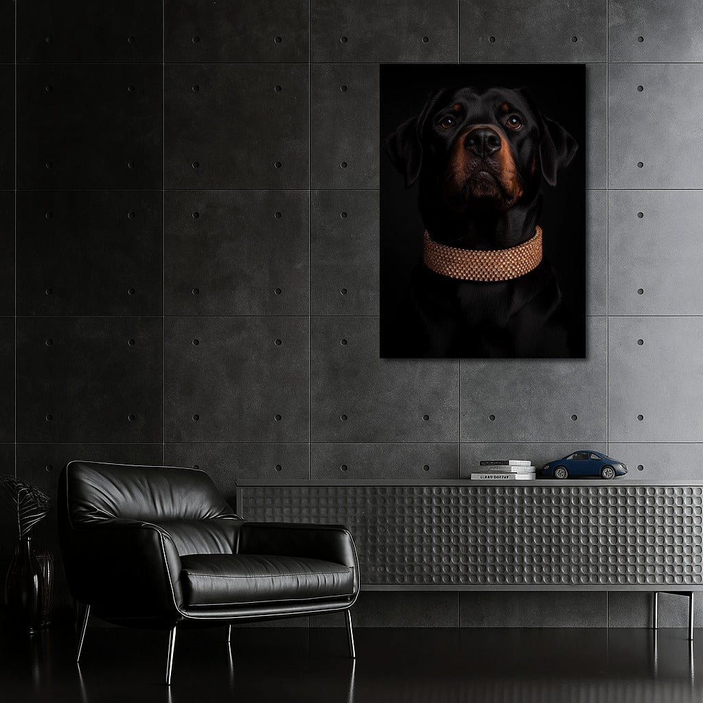 Elegance and strength in wall art: a majestic dog with a luxurious collar will add a special charm to your interior. See more from the collection: Rottweiler Art