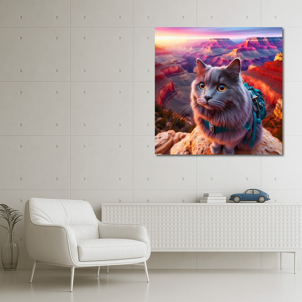 Russian Blue poster: a cat exploring the Grand Canyon surrounded by colorful rocks. Wall art for adventure lovers. See more from the collection: Animals Art