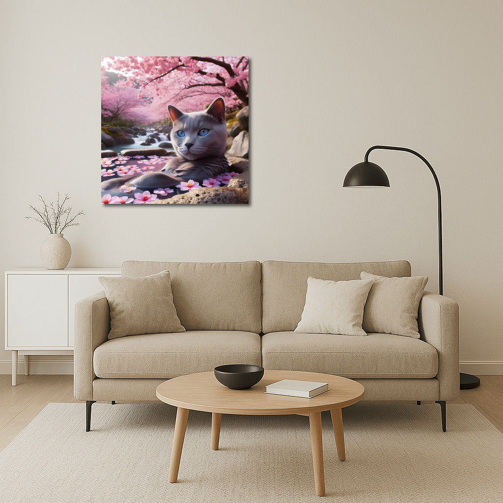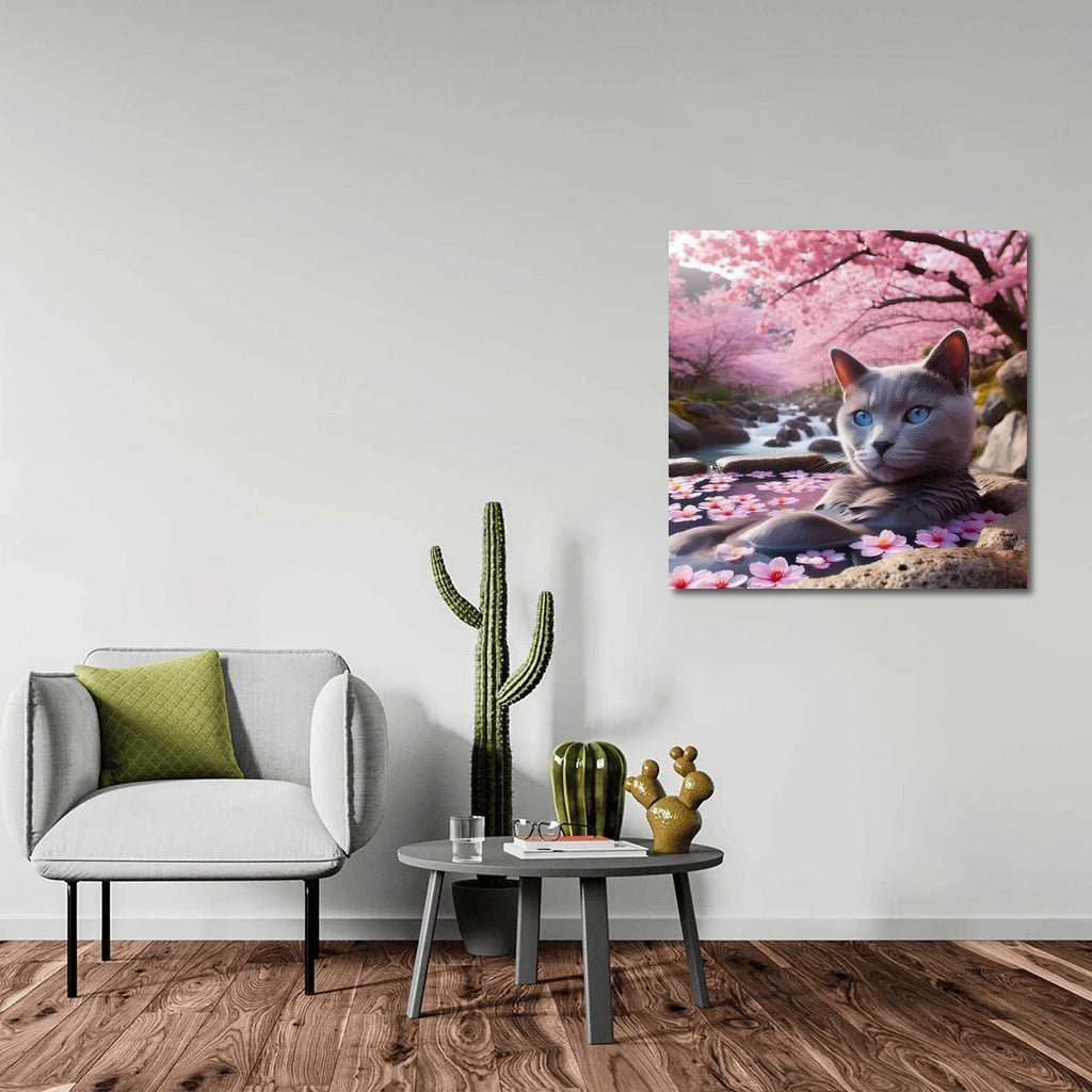 Immerse yourself in peace: Russian Blue enjoys hot springs and cherry blossoms. The perfect poster for inner harmony! See more from the collection: Animals Art