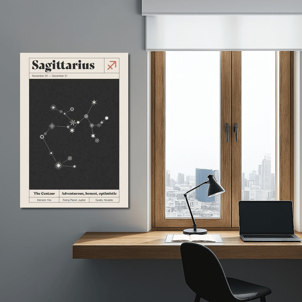 Sagittarius Zodiac Sign Poster: A Star Map of Adventure, Optimism, and Honesty. Perfect Wall Art for Dreamers. See more from the collection: Sagittarius Zodiac Sign Art