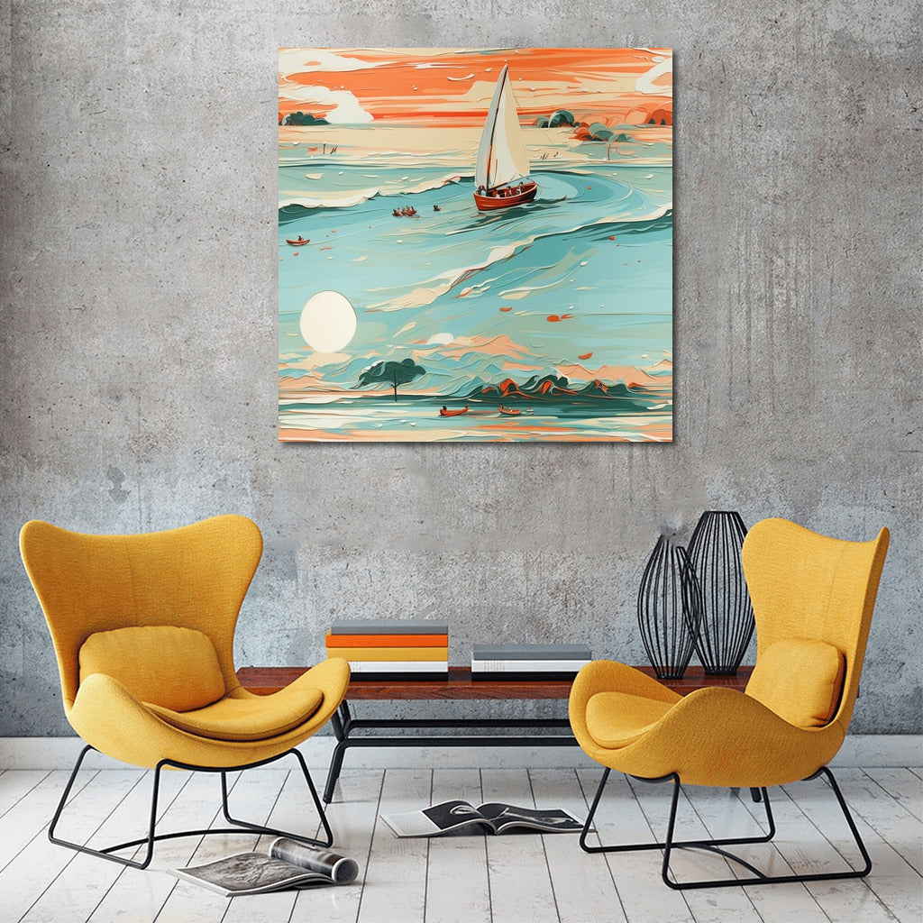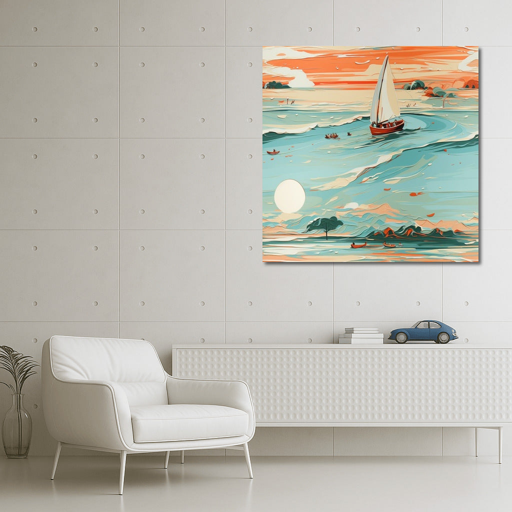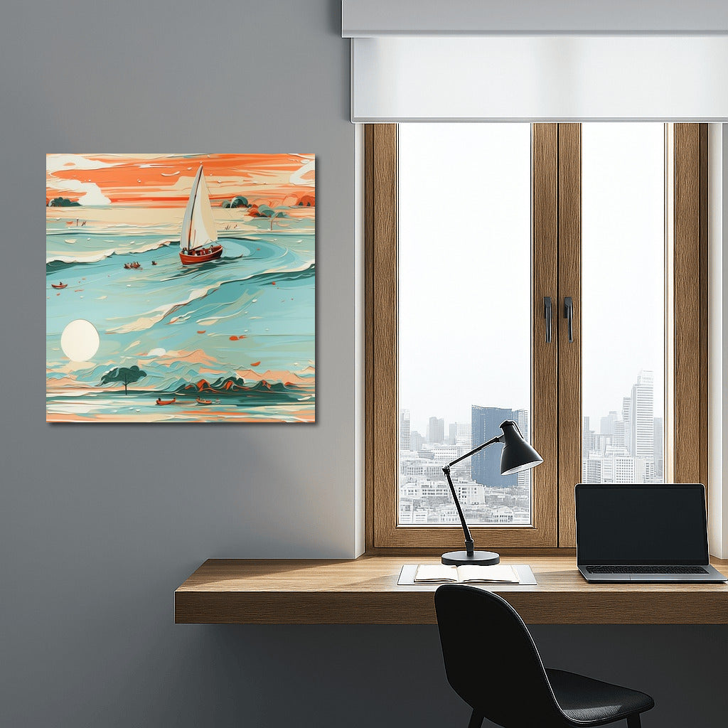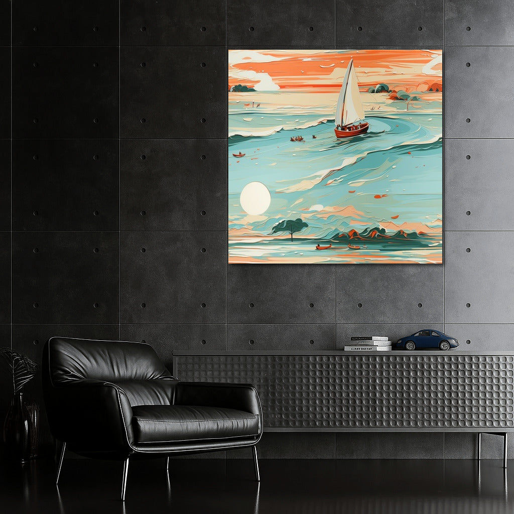 Summer breeze on the waves: a poster with a sailboat against the sunset. Magic and freedom in every stroke of the brush. See more from the collection: Mixed Wall Art