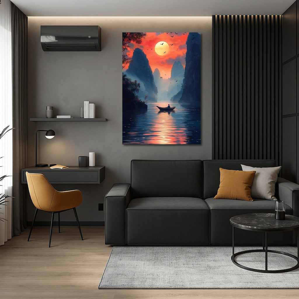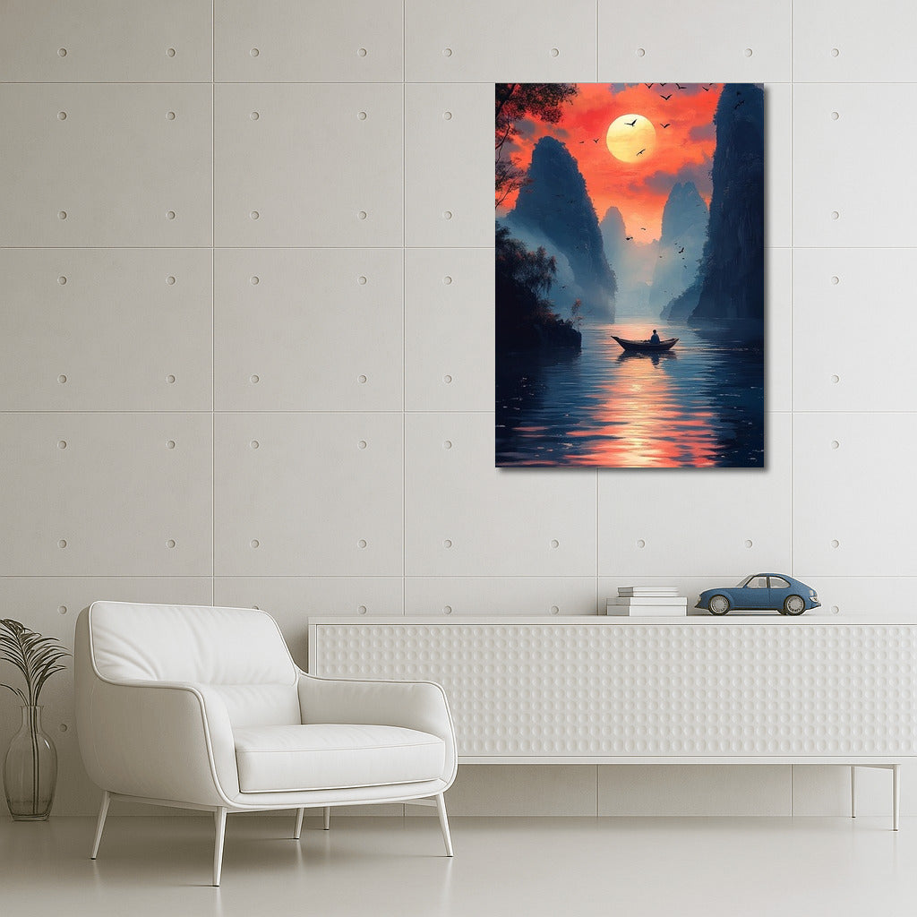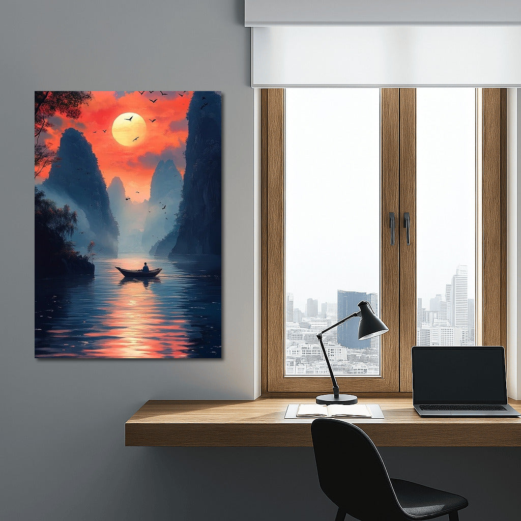 A captivating poster of a boat sailing towards the setting sun, reflected in the waters among the mountains. Wall art for dreamers. See more from the collection: Nature & Landscapes Art