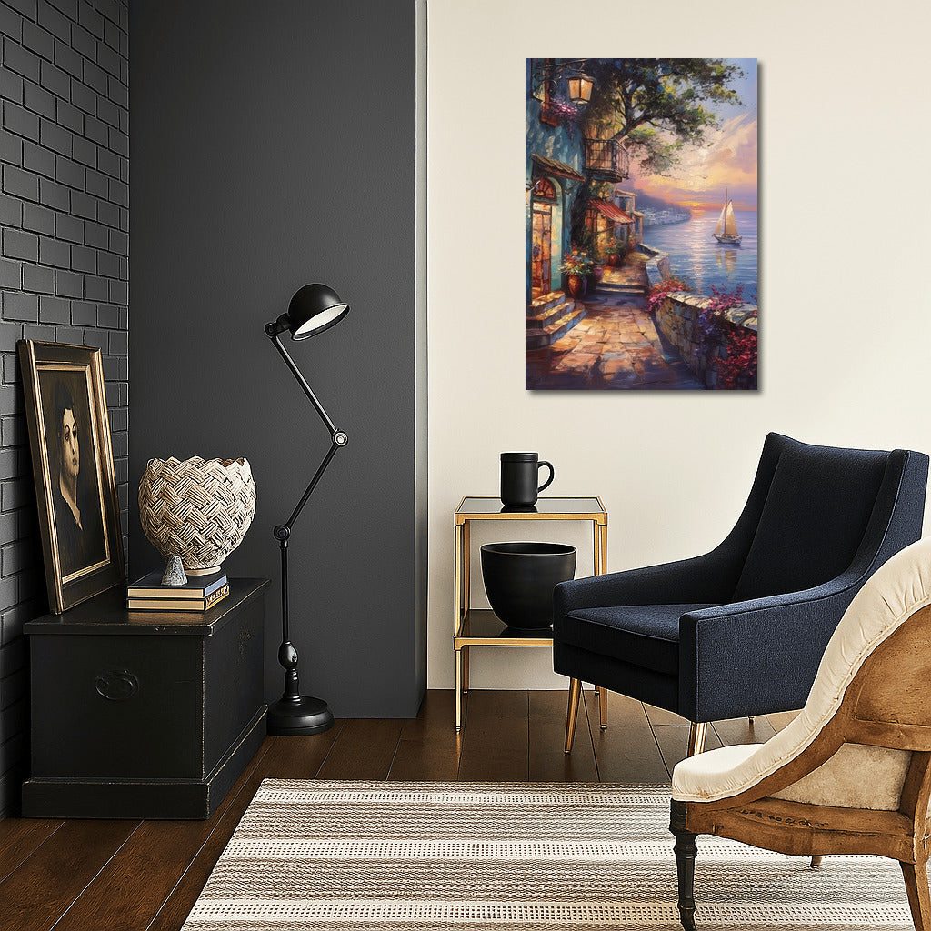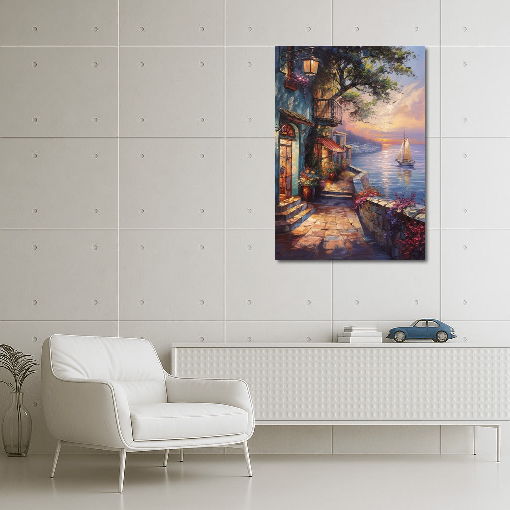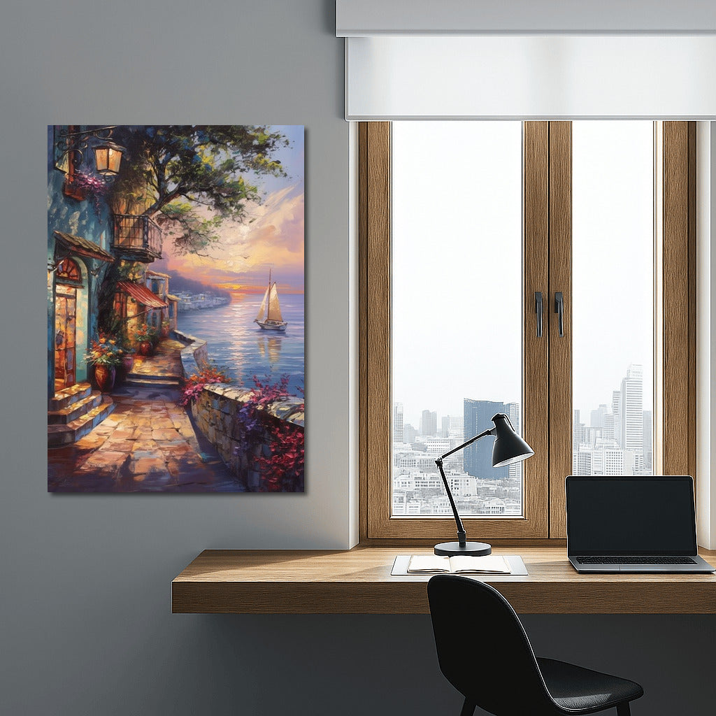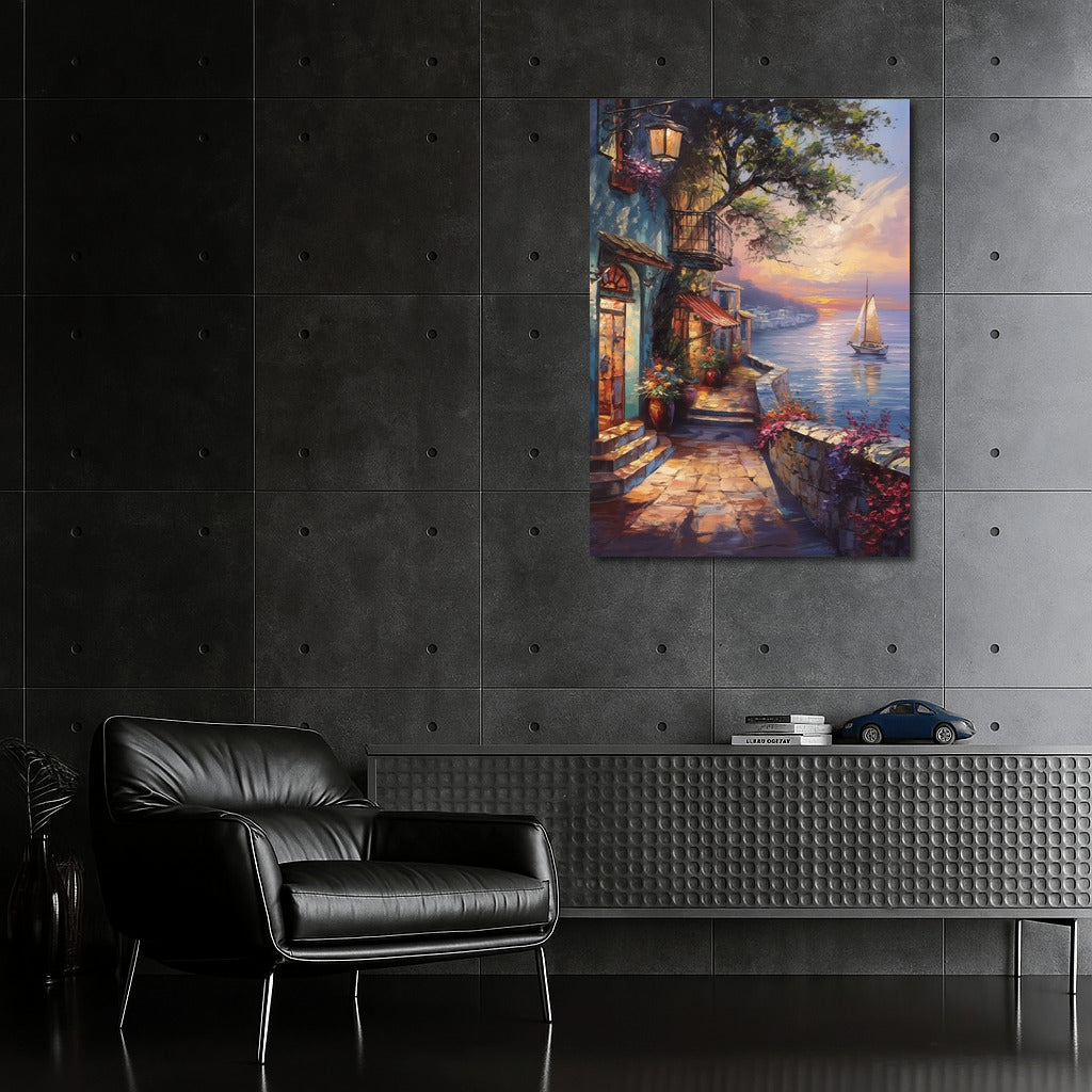 A paintingsque poster with a sea sunset and a sailboat soaring. Feel the romance of a summer evening with this wall art. See more from the collection: Mixed Wall Art