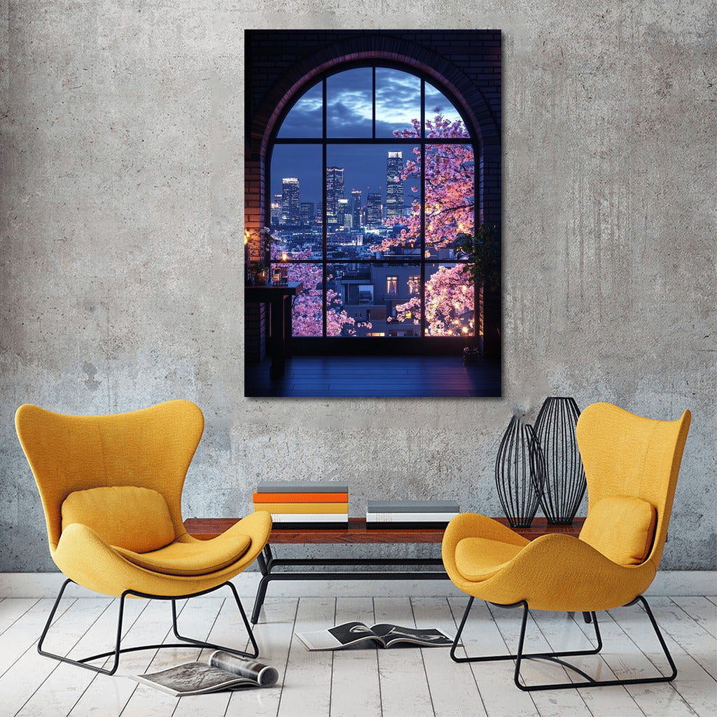 Night city and cherry blossom outside the window - a poster that immerses you in an atmosphere of silence and dreams. Wall art for the soul. See more from the collection: Cityscapes & Skylines Art