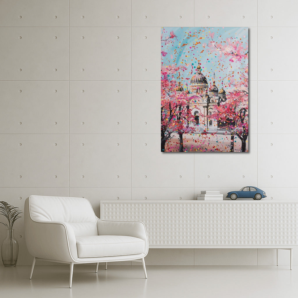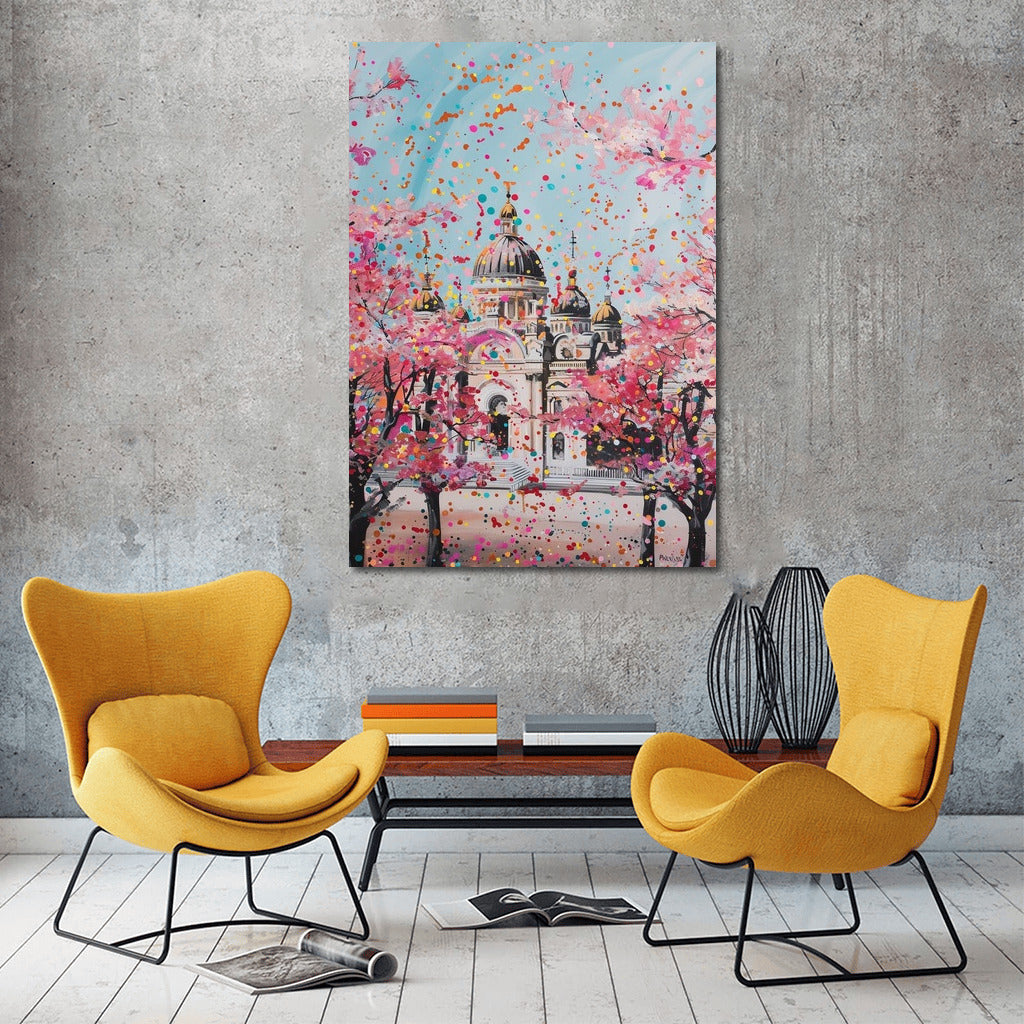 Magical poster: Spring hues of cherry blossoms frame a fairytale temple. Wall art that inspires and enchants. See more from the collection: Cherry Blossoms Art