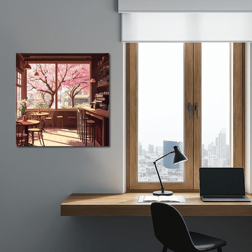 The charm of a spring cafe with blooming sakura trees outside the window is the perfect poster to create a cozy atmosphere in your space. See more from the collection: Cozy Interiors Art