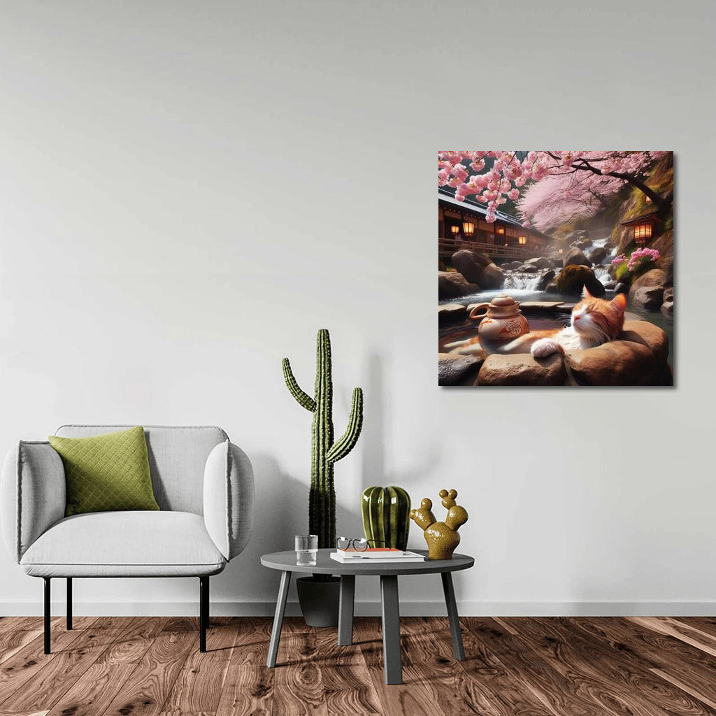 A cat enjoys a hot spring among cherry blossoms in Japan. Immerse yourself in harmony with this unique wall poster! See more from the collection: Animals Art