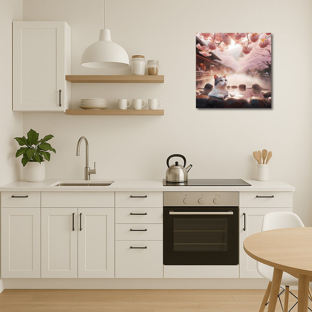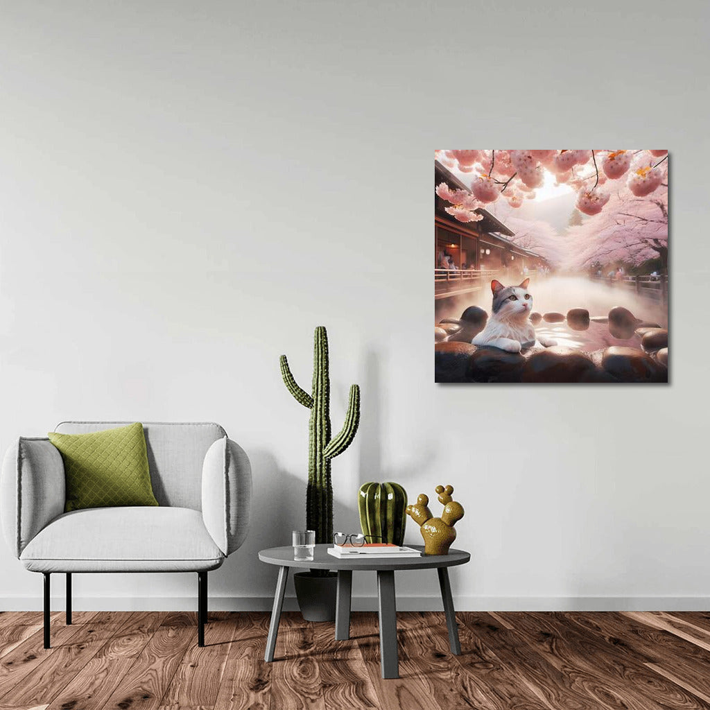Poster of a cat in a hot spring surrounded by cherry blossoms in Japan. Wall art that inspires relaxation. See more from the collection: Animals Art