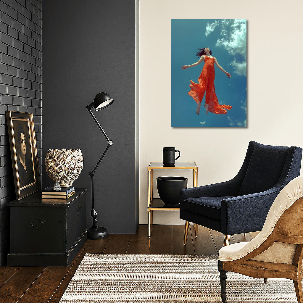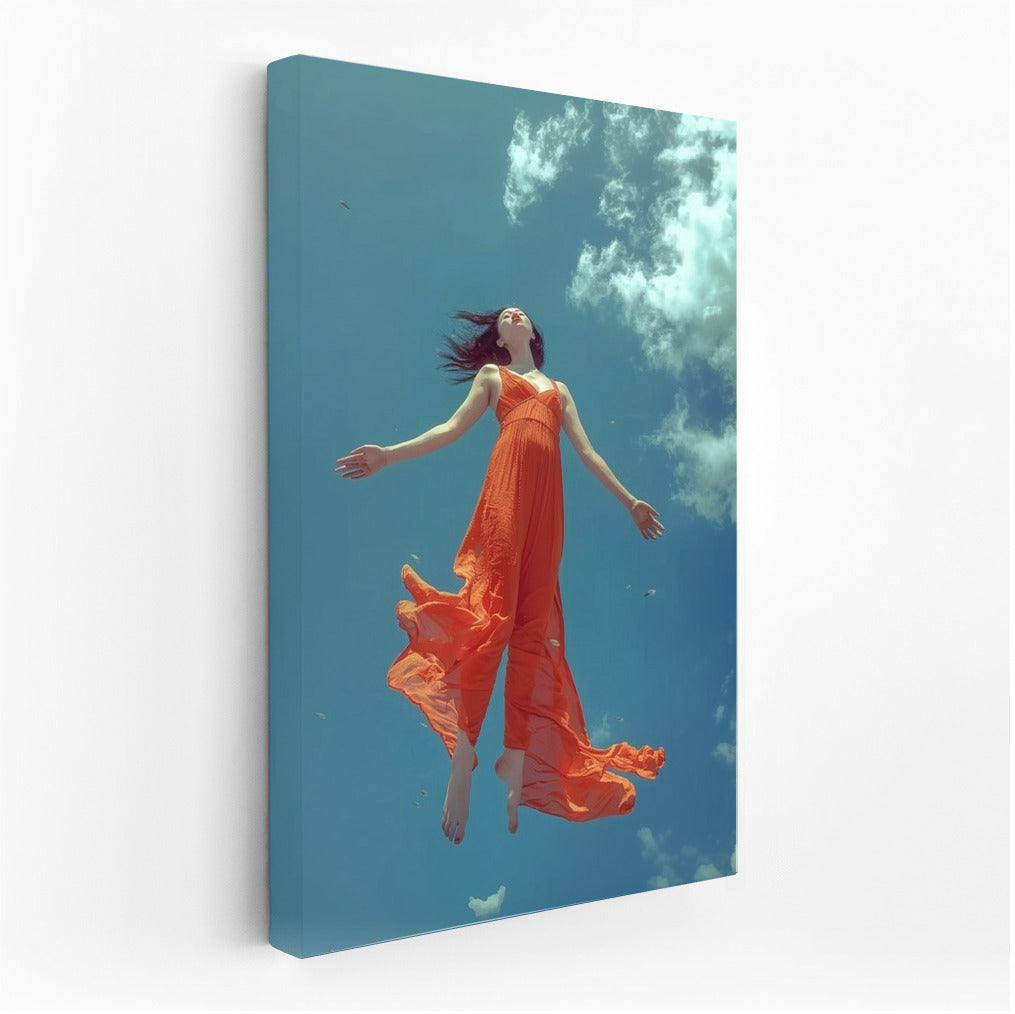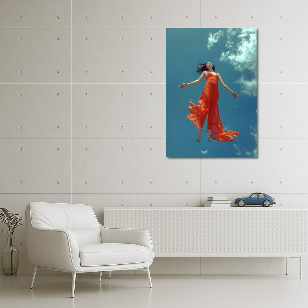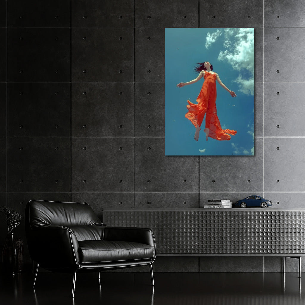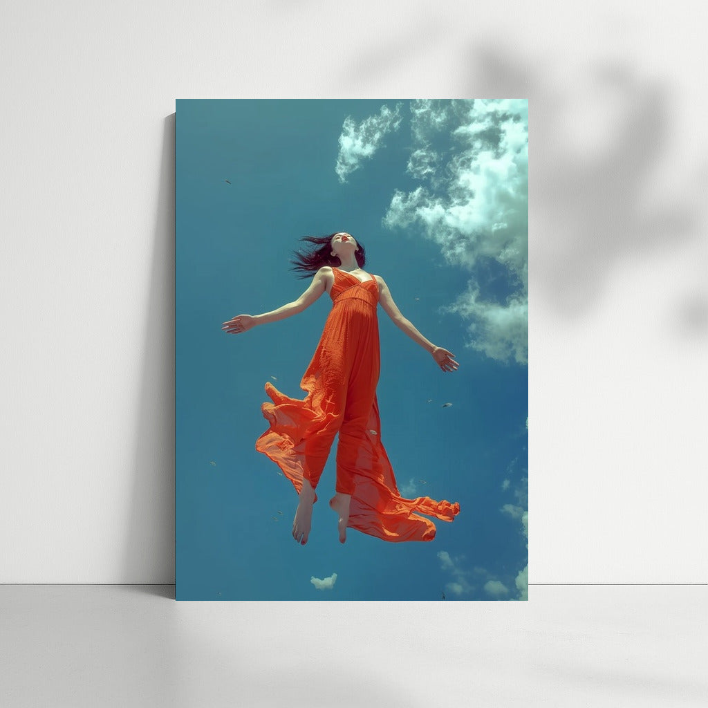 A floating figure in a scarlet dress against the sky. This poster will add an ethereal charm to your interior. Dream wall art. See more from the collection: Mixed Wall Art