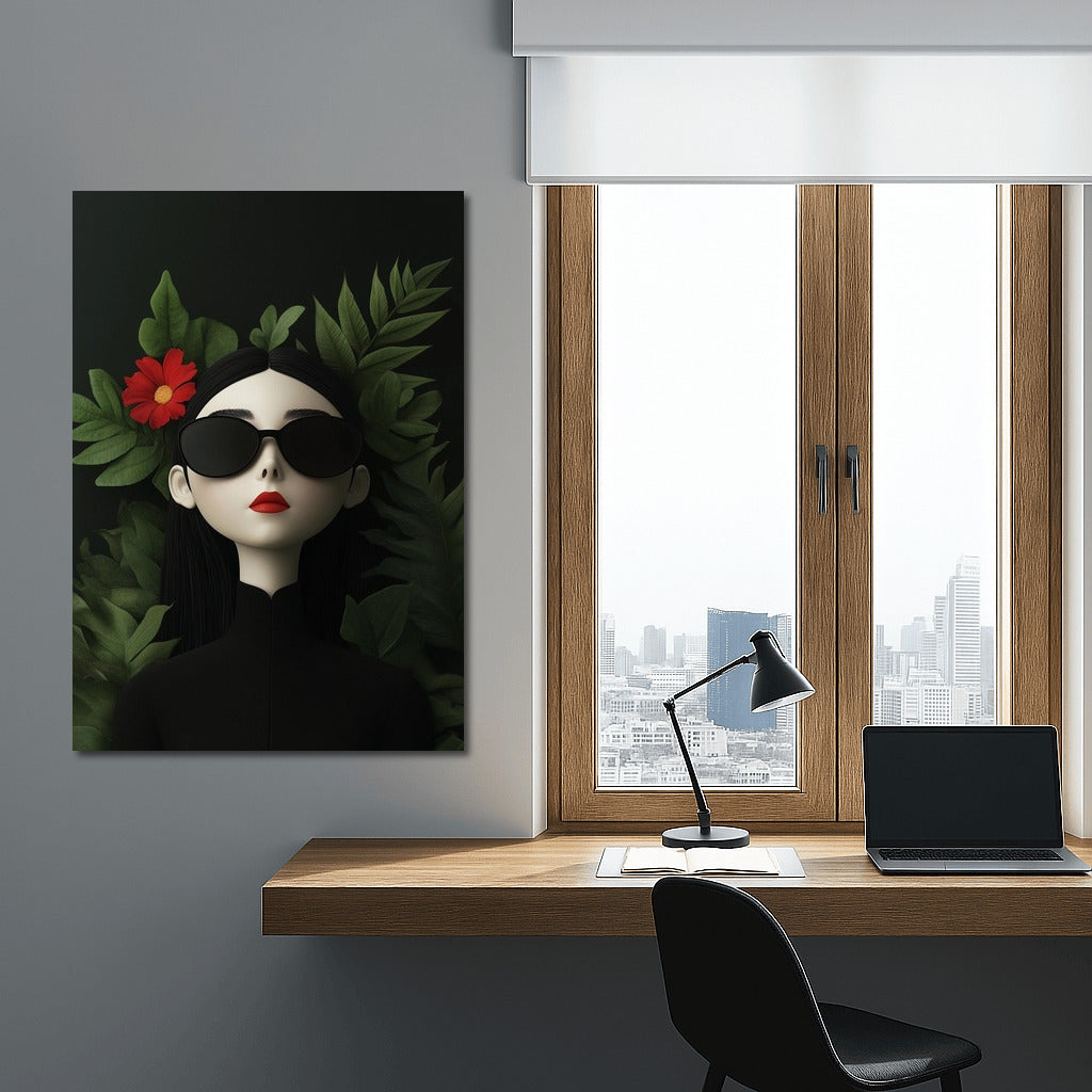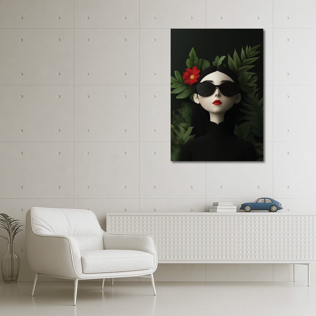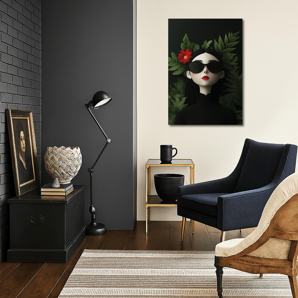 A mysterious figure with a bright red lip and flower, immersed in greenery. A stylish poster for your unique space. See more from the collection: Mixed Wall Art