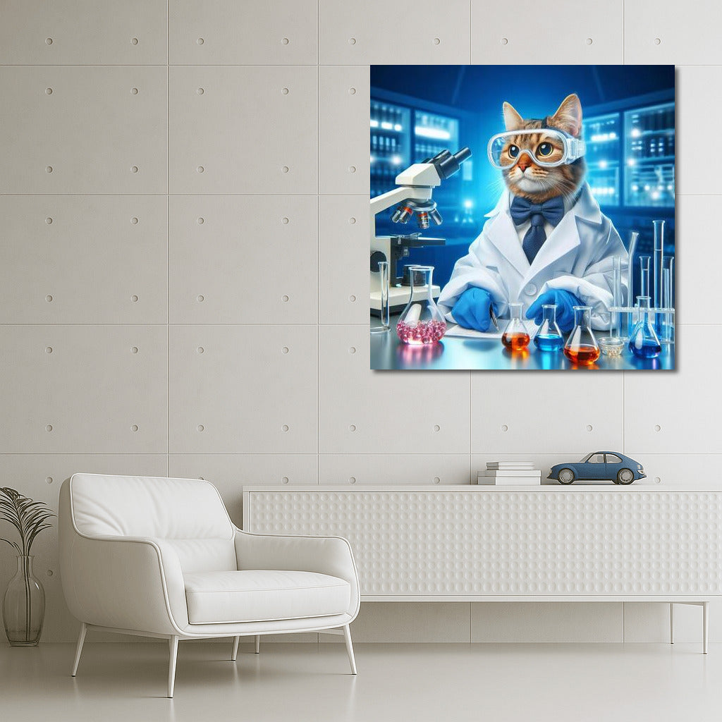 A scientific cat in a white coat conducts an experiment in a high-tech laboratory. Add some scientific charm to your wall art! See more from the collection: Animals Art
