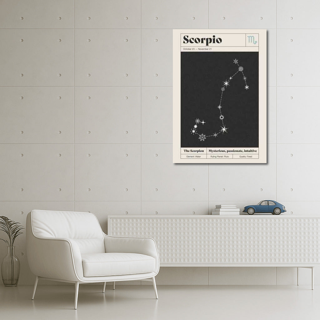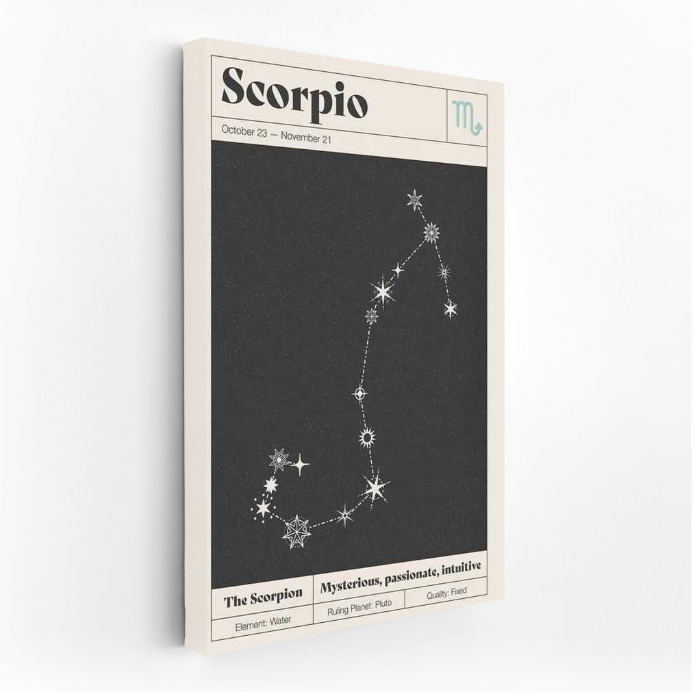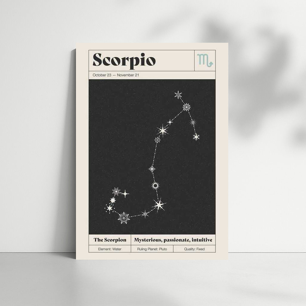 The mysterious constellation Scorpio represents passion and intuition. This poster will be a bright accent of your wall art. See more from the collection: Scorpio Zodiac Sign Art