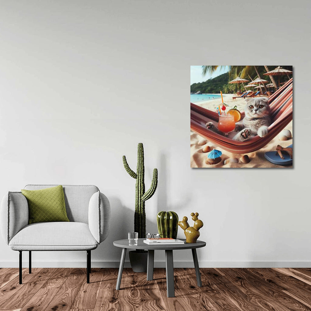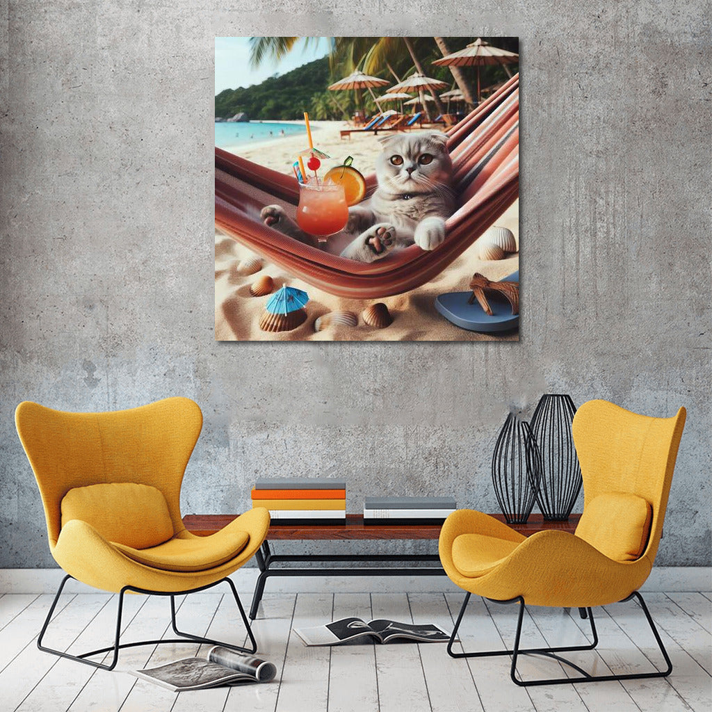 Scottish Fold Cat in a Hammock on the Beach with a Cocktail: Summer Vacation Wall Art