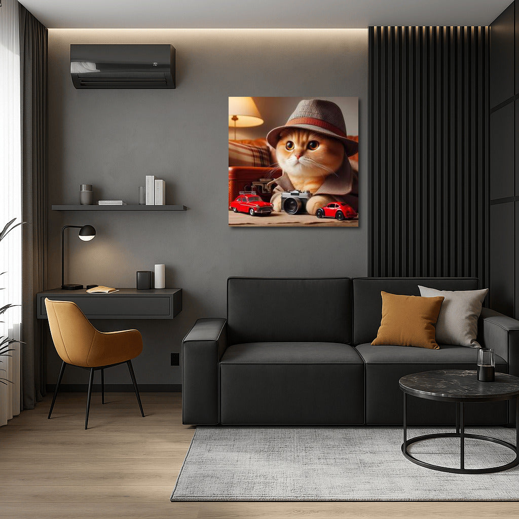 Detective charm on the poster: Scottish Fold cat with a camera and a retro car. Perfect wall art with humor! See more from the collection: Animals Art