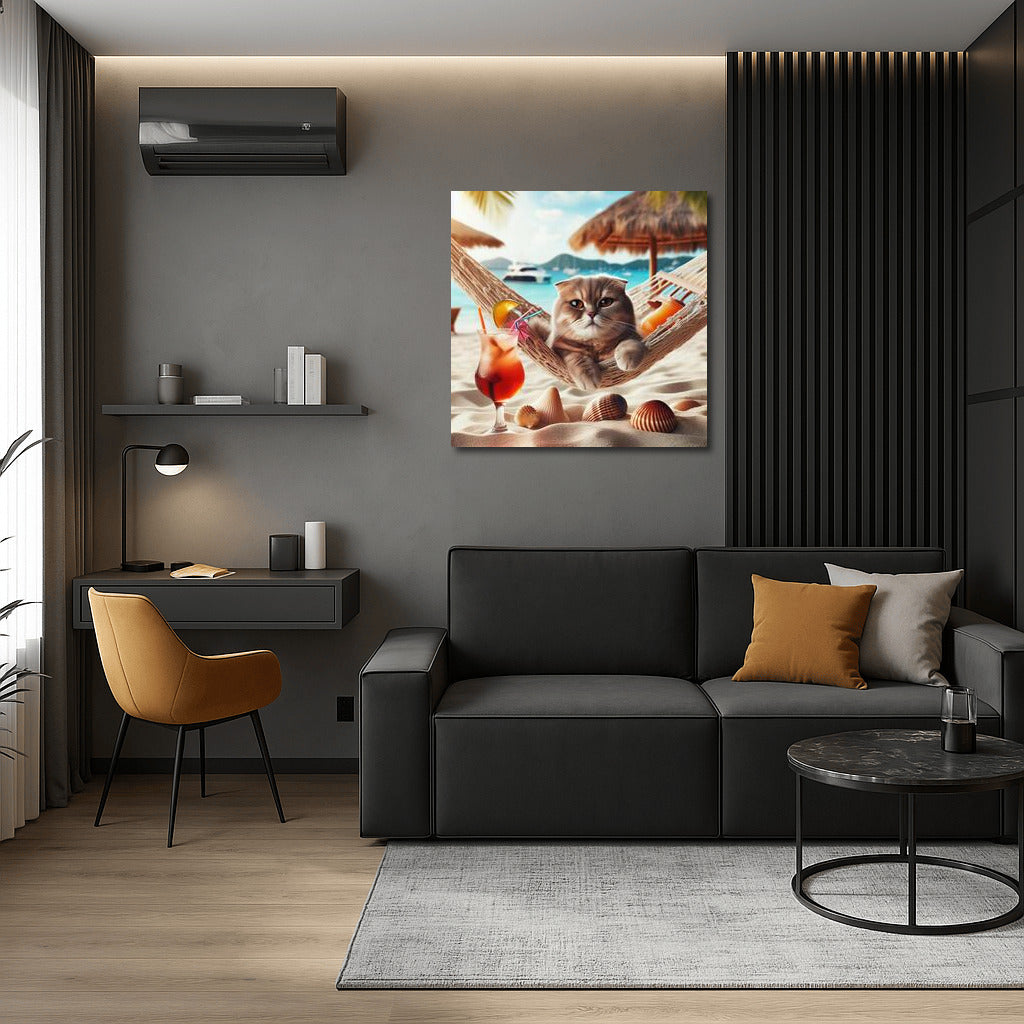 Scottish Fold cat enjoying life in a hammock on the beach with a cocktail. The perfect poster for cat lovers and relaxation! See more from the collection: Animals Art