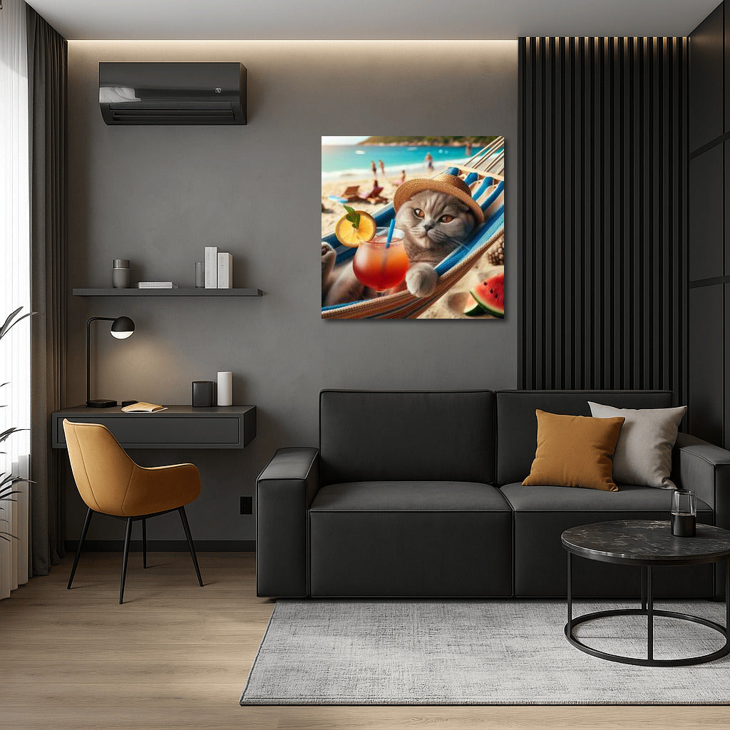Summer Relaxation: Scottish Fold cat enjoying a cocktail in a hammock on the beach. Perfect wall art for relaxing! See more from the collection: Animals Art