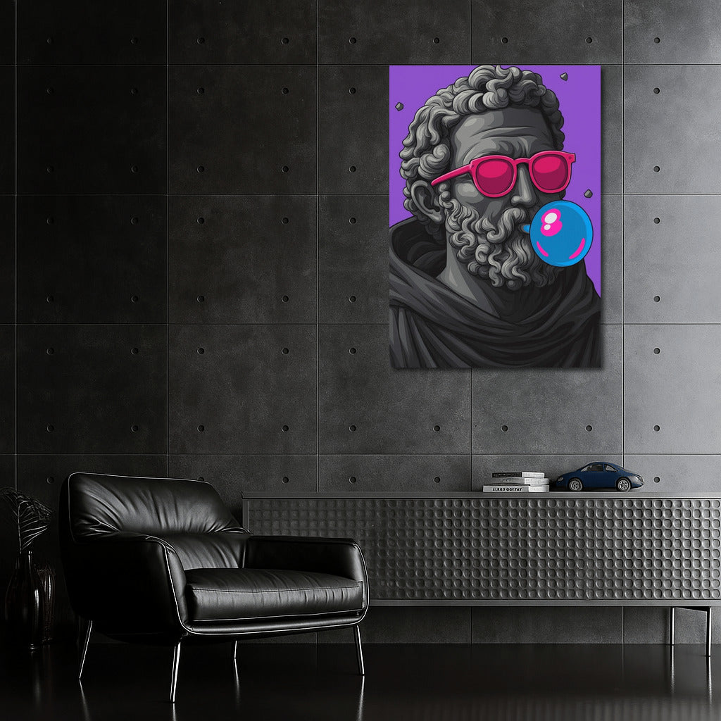 A sculpture with bubble gum and bright glasses. A perfect poster for stylish wall art. See more from the collection: Hipsters Art