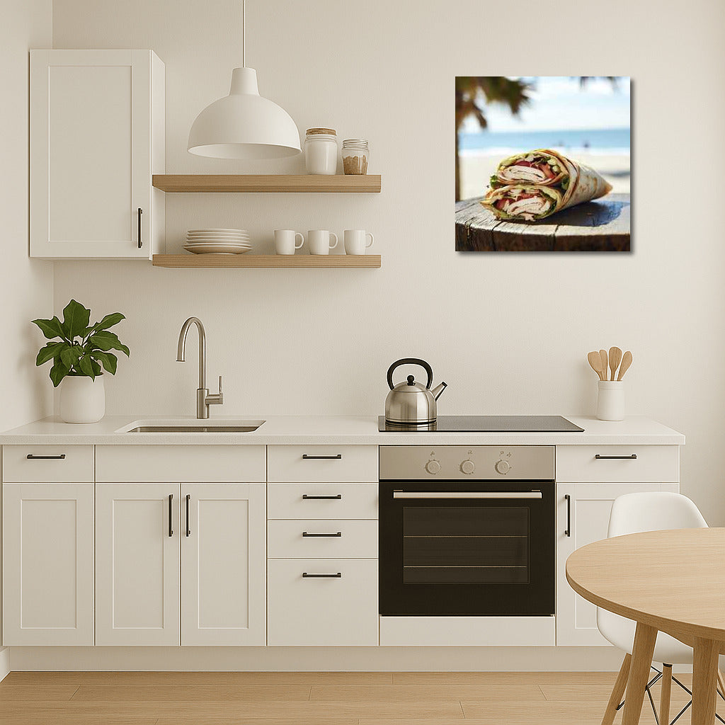 A juicy poster with a delicious chicken roll against the backdrop of the sea will enliven the interior and awaken gastronomic dreams! See more from the collection: Food Art