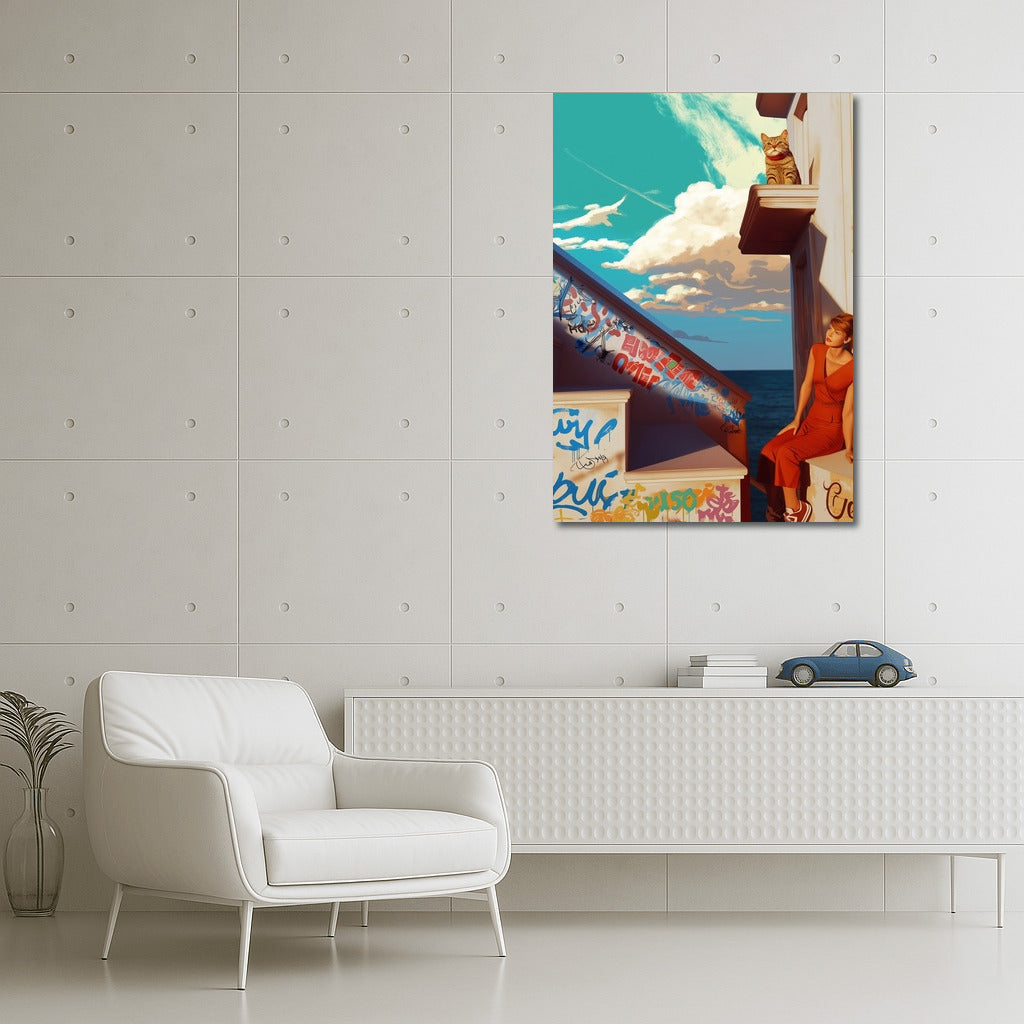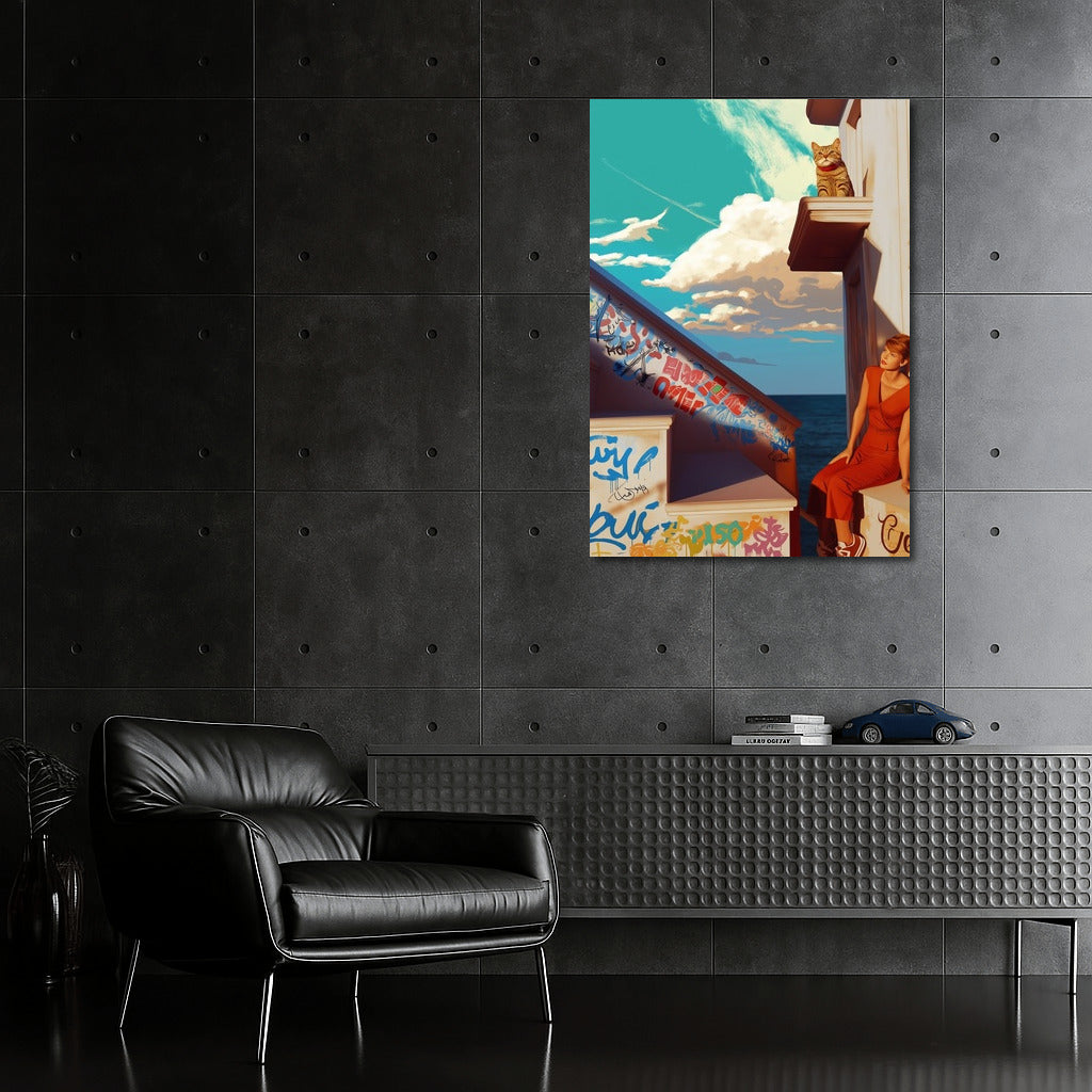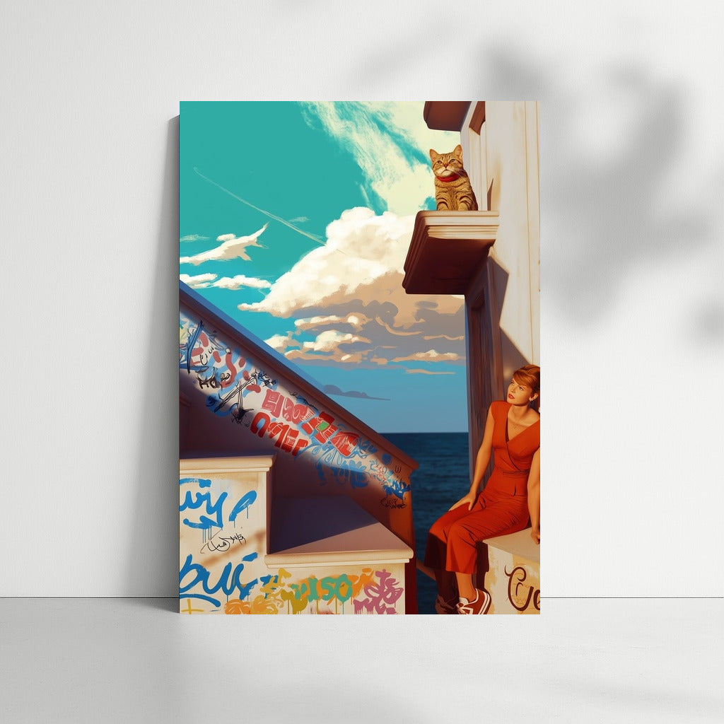 Wall art with bright graffiti, a cat and a thoughtful figure by the sea. Add a stylish poster to your dream interior! See more from the collection: Urban Art