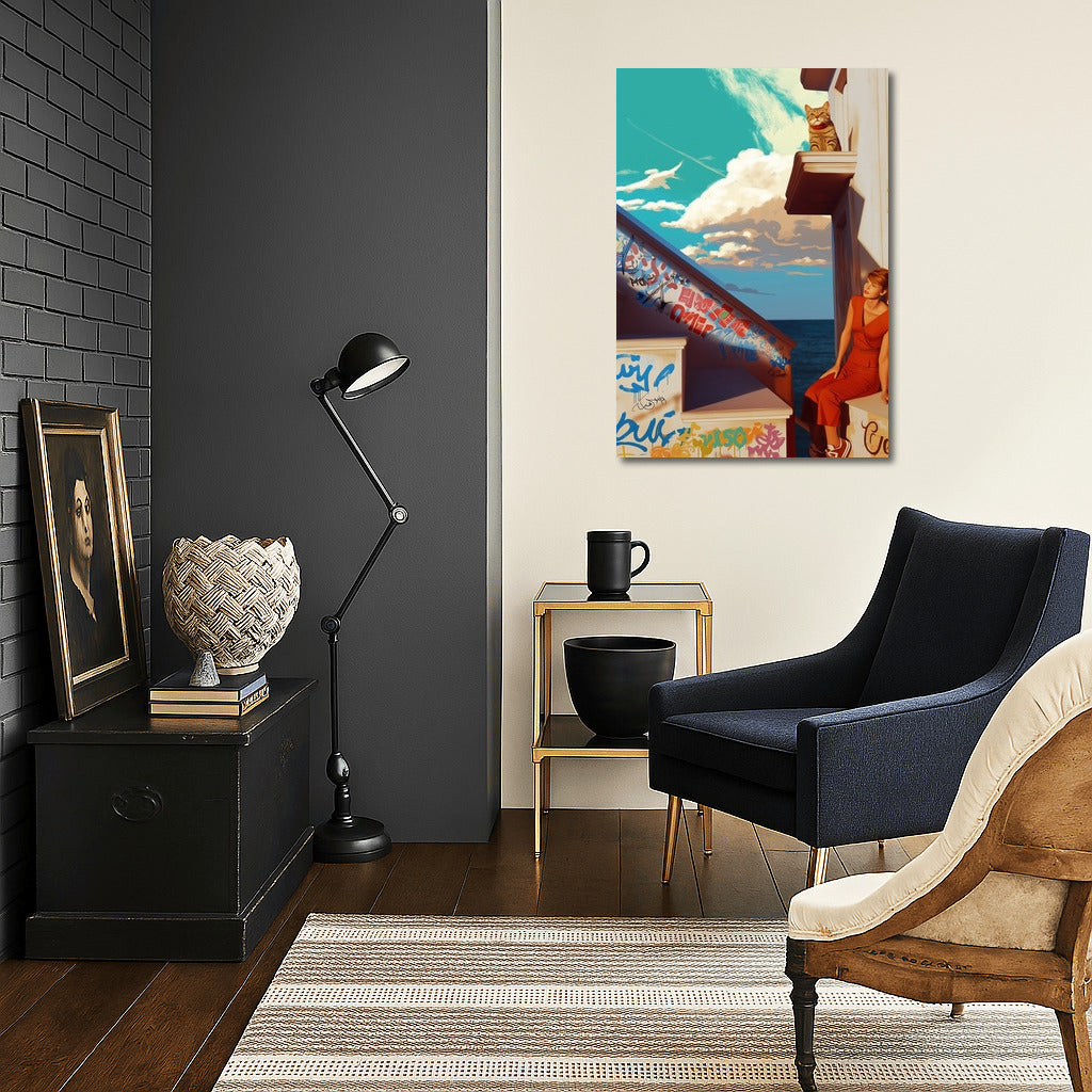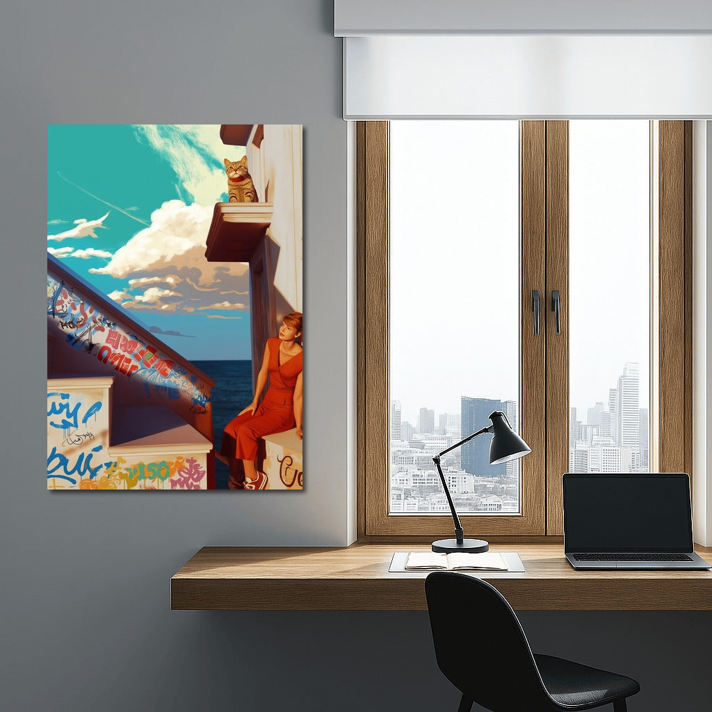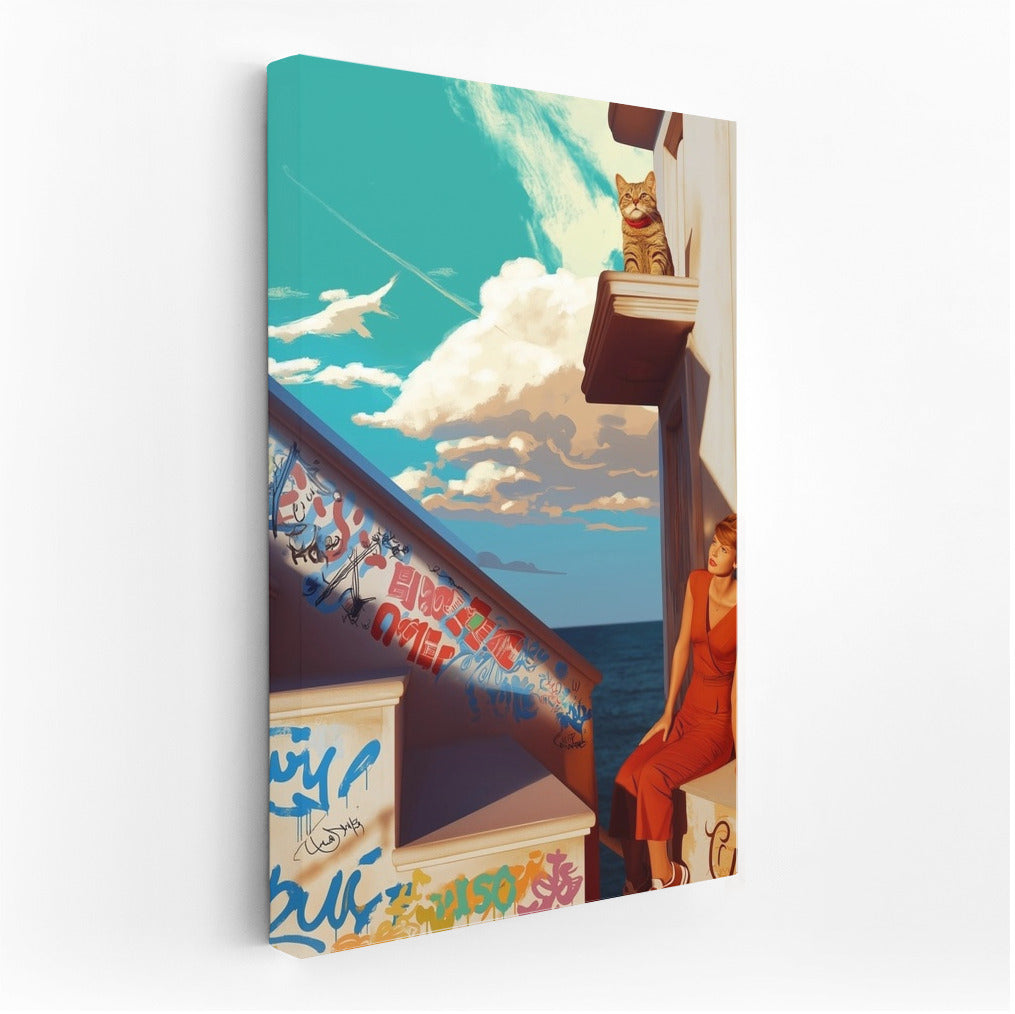 Wall art with bright graffiti, a cat and a thoughtful figure by the sea. Add a stylish poster to your dream interior! See more from the collection: Urban Art