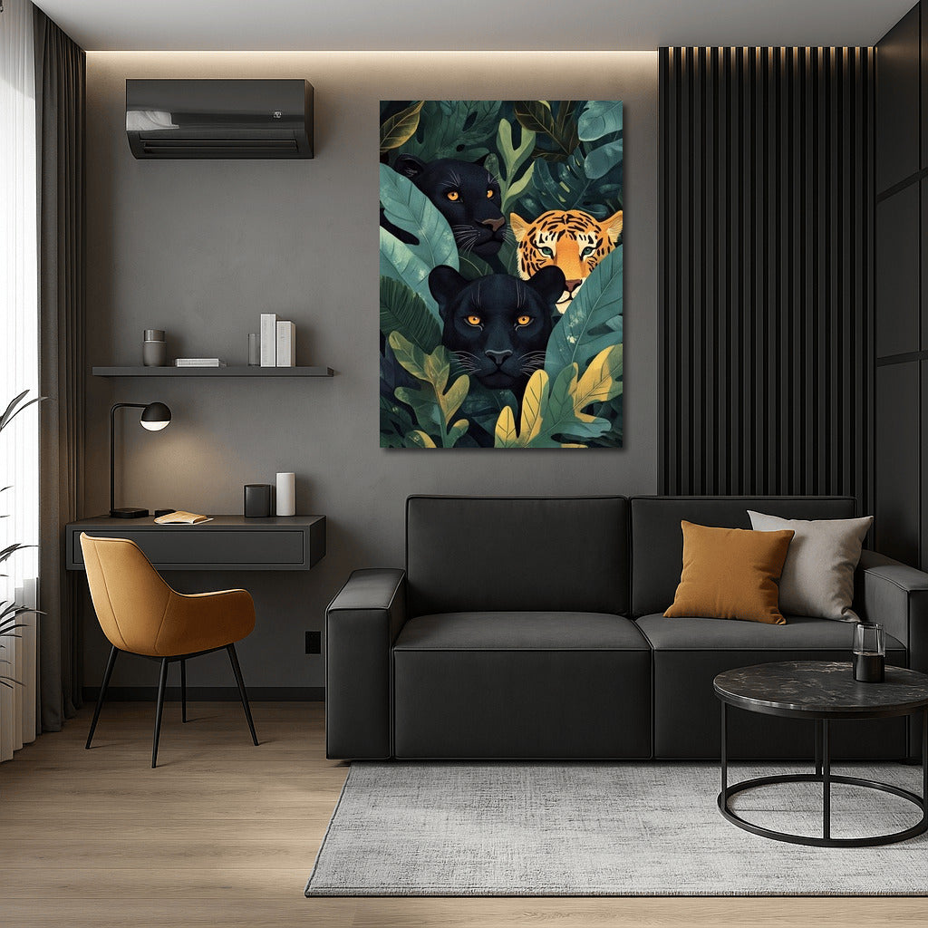 Dark panthers and a tiger hide in the jungle in this exciting poster. Give your walls a mysterious charm of wild nature! See more from the collection: Animals Art