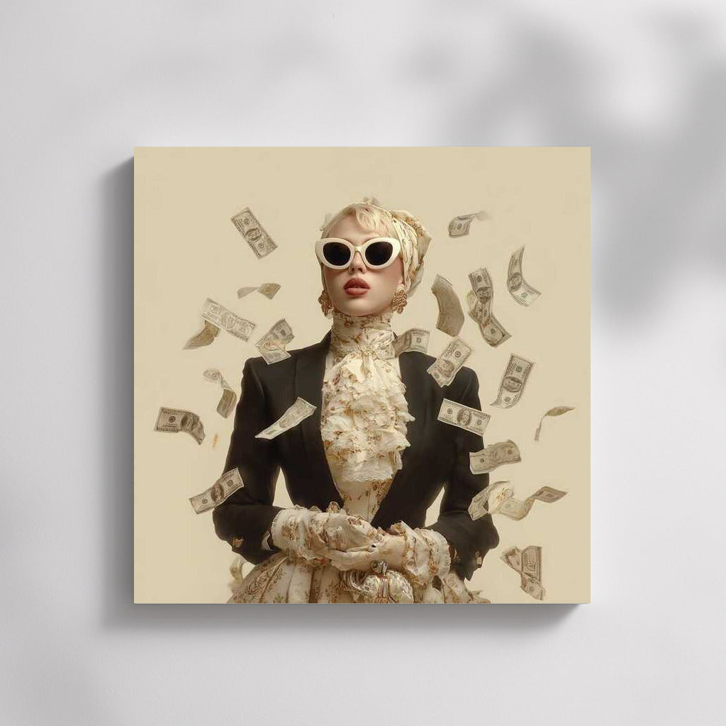 An elegant poster featuring a mysterious figure in a swirl of banknotes. The wall art exudes style and luxury and is mesmerizing. See more from the collection: Money Art