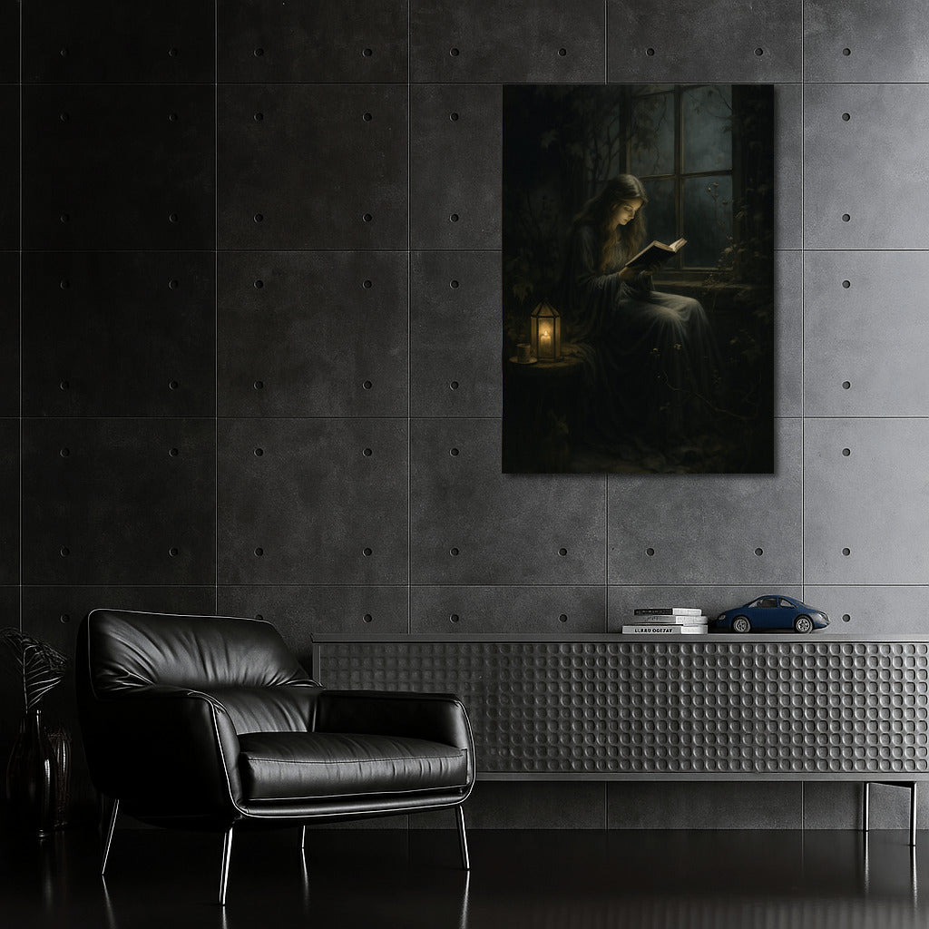 In the mysterious light of the candle, the figure is immersed in a world of books. This painting is the perfect poster for fans of Dark Academia. See more from the collection: Dark Academia Art